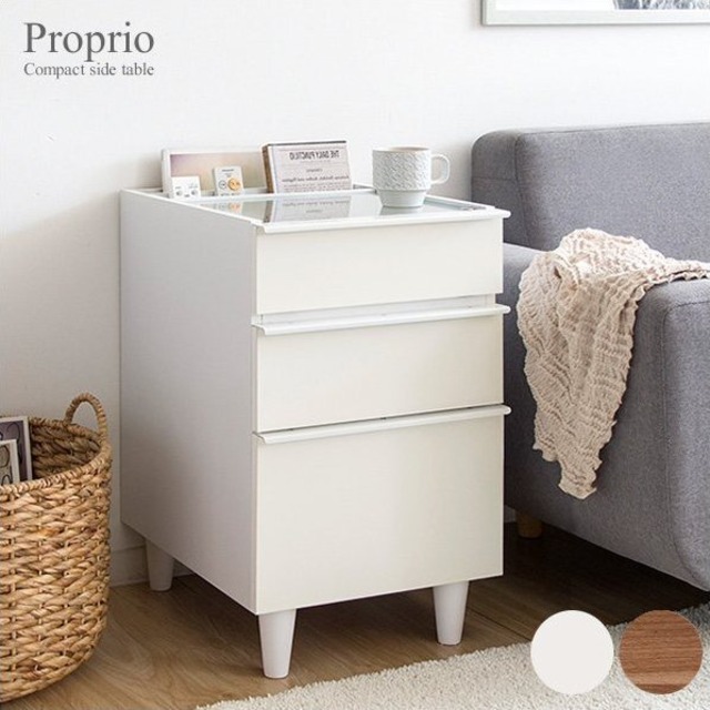 幅35cmとコンパクトでお部屋に置きやすいサイドテーブル『Proprio(プロプリオ)』。一段目の収納が見えるガラス天板で、お気に入りを飾ってディスプレイをお楽しみいただけます。 深さの違うラックや、スライドレール付きの引き出し2杯と小さい見た目ながらたっぷりと収納できます。シンプルで上品な見た目は主張しすぎずリビングや寝室など場所を選ばずご使用いただけます。 カラーはブラウンとホワイトの2カラーをご用意。お部屋の雰囲気やお好みでお選びいただけます。 サイズ 幅35×奥行47×高さ60cm 材質 合成樹脂化粧合板(メラミン)、プリント紙化粧繊維板、5mm厚強化ガラス、天然木 耐荷重 ガラス天板:2kg 備考 組立品(約60分) ※この商品は基本送料無料です。 但し、北海道・沖縄・離島への配送には別途送料のお見積りが必要になります。ご注文前にお問い合わせ下さい。 ※説明画像には小物など商品以外のものも掲載しています。 ※通常3営業日以内で発送いたします。 ※お急ぎの場合は日時指定はせずにご注文ください。 可能な限りの最短発送いたします。