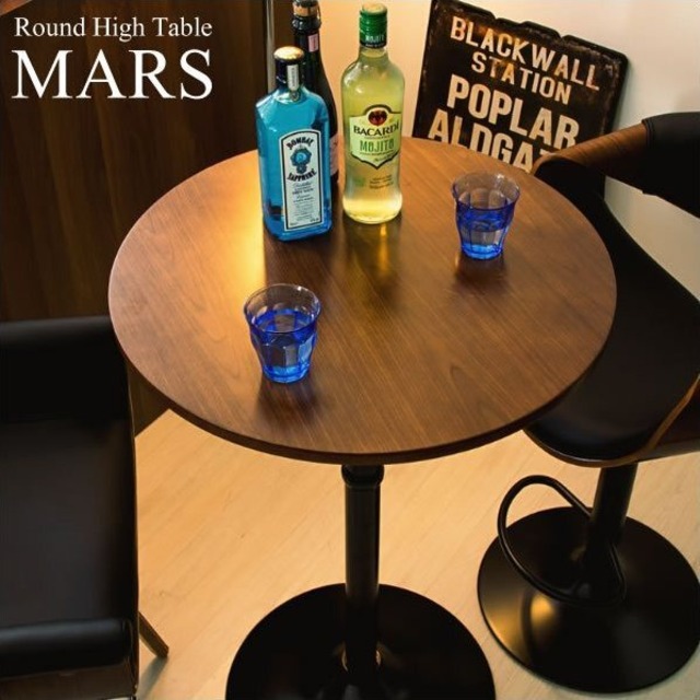 径60cmの大きめなラウンド型で、高さ90cmとバーチェアやハイスツールにちょうど良いハイテーブル『MARS(マルス)』。 シンプルなラウンドテーブルは大人なバー使いもお喋りやお茶をゆっくり楽しむカフェ使いのどちらにもピッタリ♪木目が美しく落ち着きのあるブラウンの天板がお部屋の雰囲気に馴染みます。 シックなブラックの太いスチール脚が、瓶やグラスをたくさん置いた天板でもしっかりと支えます。 サイズ 径60×高さ90cm 材質 天然木突板貼りMDF(ラッカー塗装) スチール(粉体塗装) 耐荷重 天板:10kg 備考 組立式(約10分) ※この商品は基本送料無料です。 但し、北海道・沖縄・離島への配送には別途送料のお見積りが必要になります。ご注文前にお問い合わせ下さい。 ※説明画像には小物など商品以外のものも掲載しています。 ※通常3営業日以内で発送いたします。 ※お急ぎの場合は日時指定はせずにご注文ください。 可能な限りの最短発送いたします。