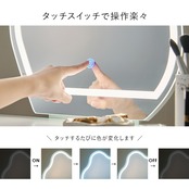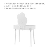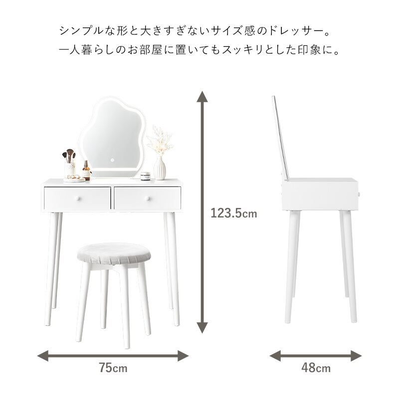 LEDの女優ライト付きのドレッサー。ホワイトのシンプルな本体に特徴的なウェーブミラーを合わせた大人可愛いデザインが魅力的。たっぷり収納ができて、一緒に使えるスツール付と使い勝手も優れています。