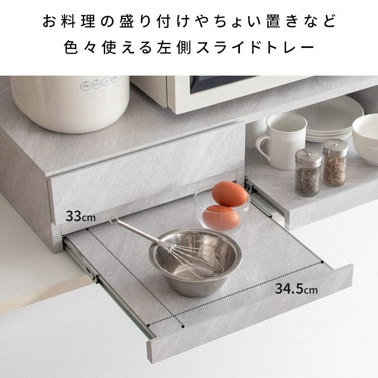二連のトレーにそれぞれ調理器具や料理がサッと置けて家事効率アップ間違いなし。引き出し収納もありカトラリーやキッチン雑貨も収納できます。