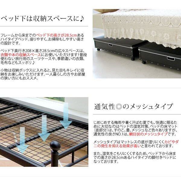 丈夫なアイアンを使用した安定感のあるベッド。フレームから床までの高さが28.5cmあるハイタイプで床下は収納スペースに!