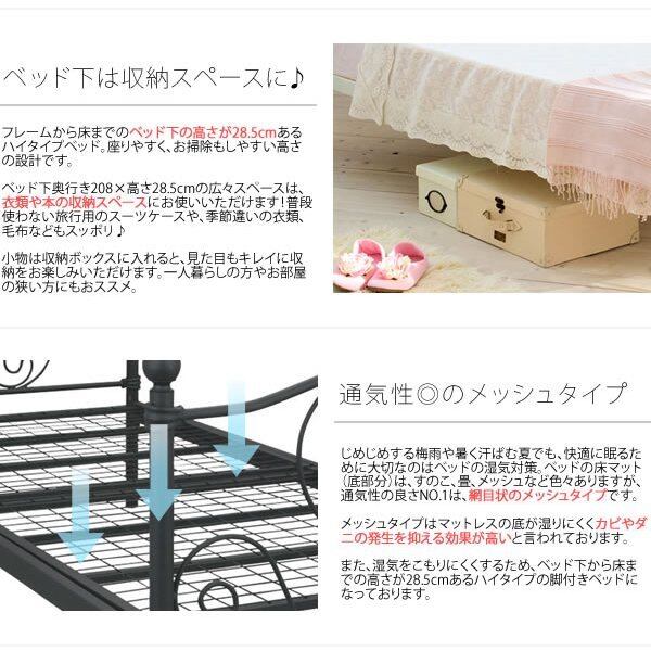丈夫なアイアンを使用した安定感のあるベッド。フレームから床までの高さが28.5cmあるハイタイプで床下は収納スペースに!