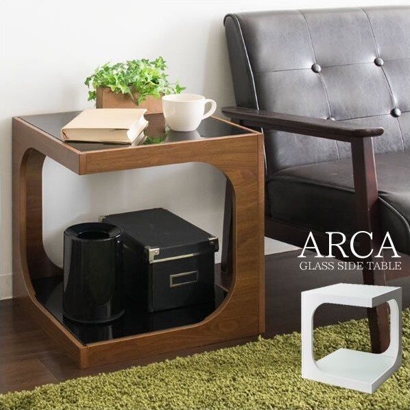 四角いキューブ型をくり抜いたようなスタイリッシュなガラス天板と木製フレームのサイドテーブル『ARCA(アルカ)』。