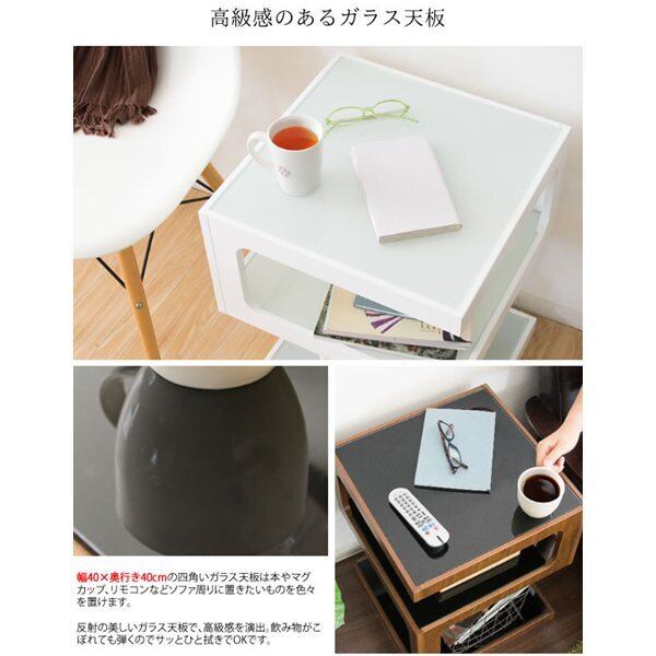 四角いキューブ型をくり抜いたようなスタイリッシュなガラス天板と木製フレームのサイドテーブル『ARCA(アルカ)』。