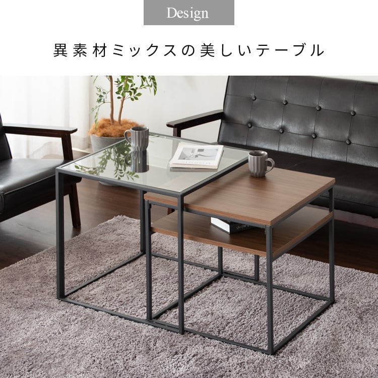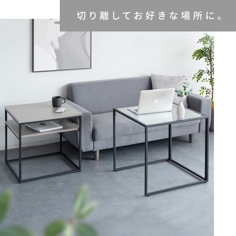 美しいガラス天板のテーブルと棚付き木製テーブルは重ねたり切り離したり、自由なレイアウトが可能です。