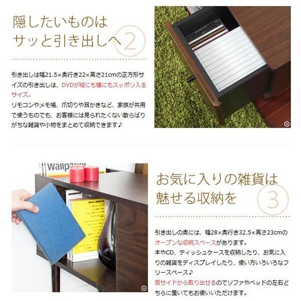 引き出しやブックスタンド付きのたっぷり収納ですが、スリムで場所を取らず、ソファサイドやベッドサイドにピッタリ!