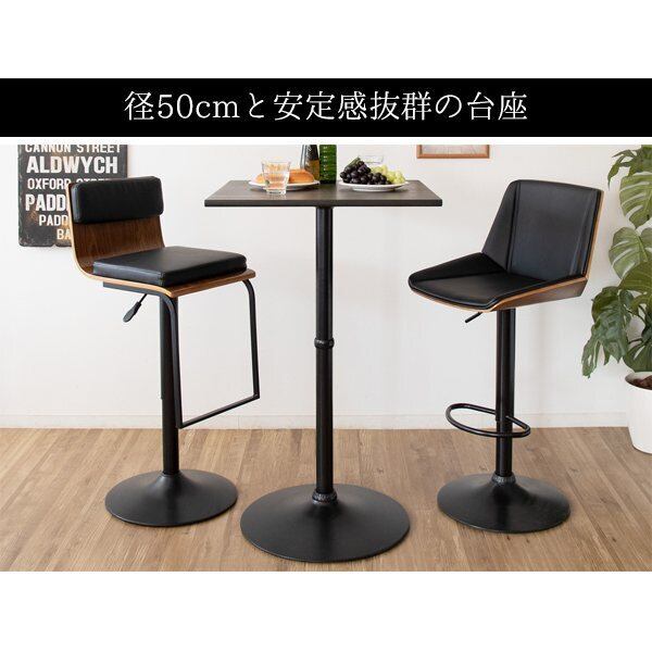 台座は通常よりも大きめな径50cmと安定感抜群。マットなブラックのスチール脚が、瓶やグラスをたくさん置いた天板でもしっかりと支えます。