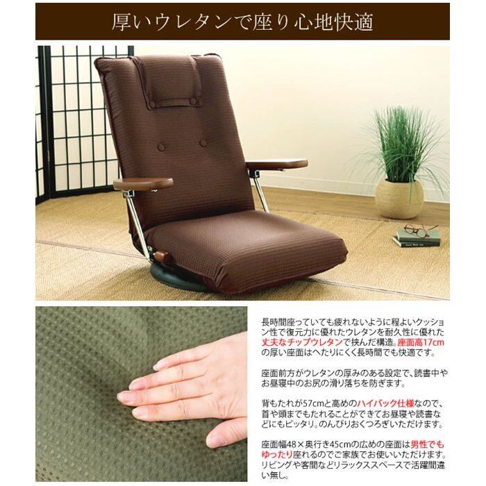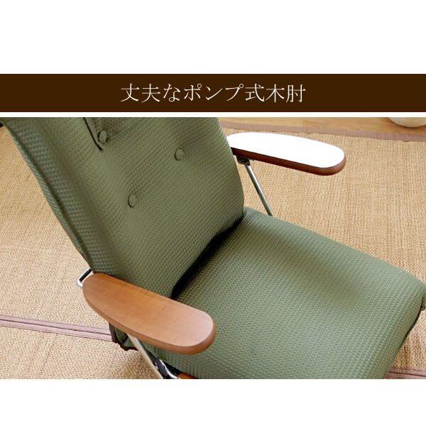 簡単に跳ね上がるポンプ式の肘置きがついた、落ち着きのあるベーシックな日本製座椅子『UGUISU(うぐいす)』。