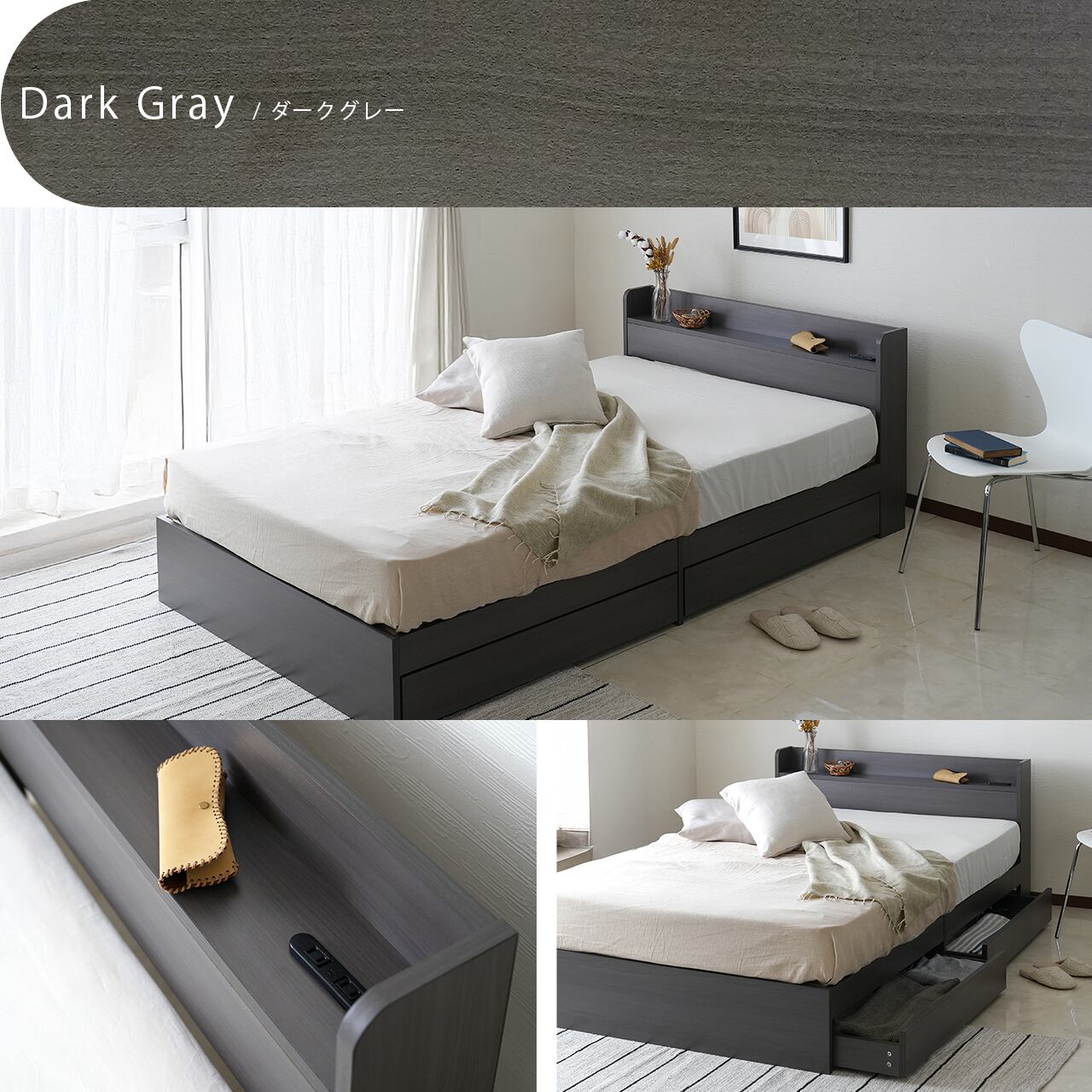 シンプルなデザインでも実用的な多機能をしっかり備えたベッドフレームです。