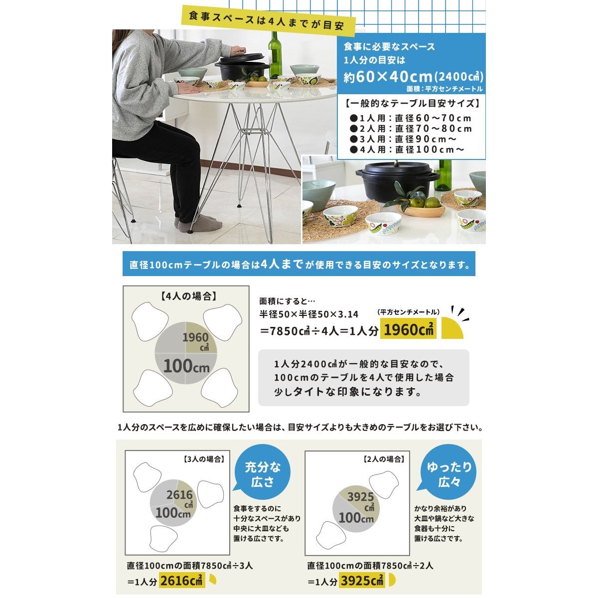 最大4人までが目安の100cm天板は食事だけでなく勉強やPC作業など様々な場面で活躍します。