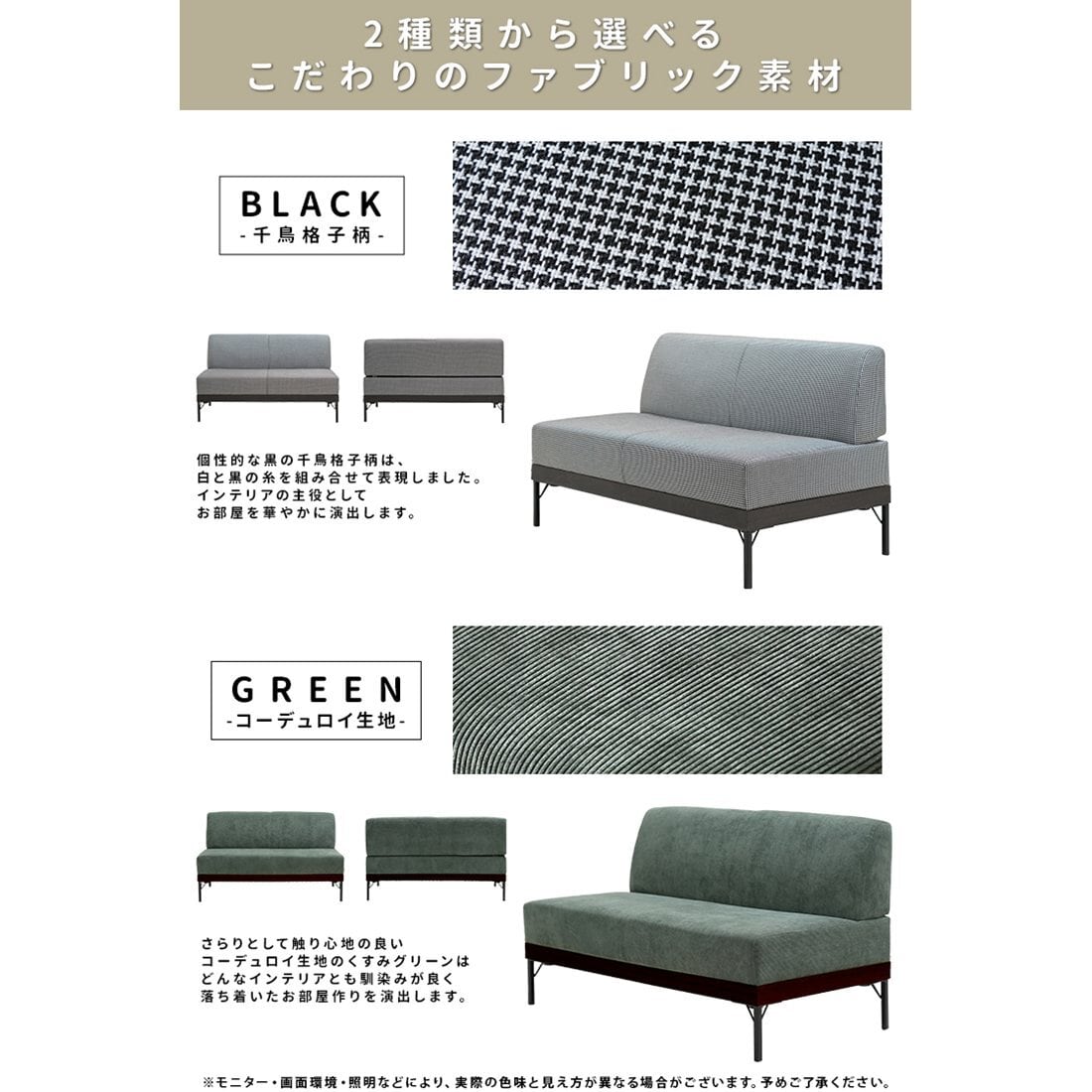 アームレスベンチソファ トリア Toria x81252 幅120cm ダイニングソファ ファブリック ベンチタイプ ブラック グリーン 千鳥格子 コーデュロイ ダークブラウンフレーム アジャスター付き