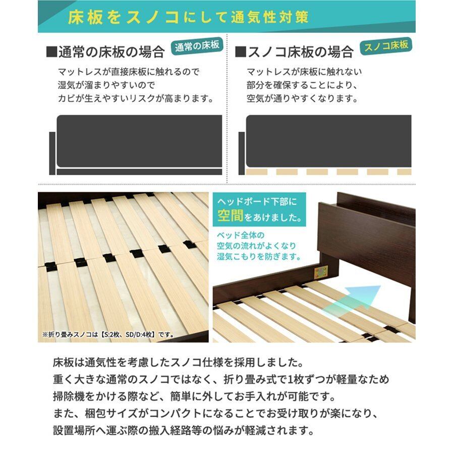 スマホや雑貨が置ける棚スペースは、使いやすいUSBポート付きの2口コンセント仕様となっております。 マットレスを落とし込むフレームのため、カバーやマットレスがずれにくく、見た目もすっきりします。