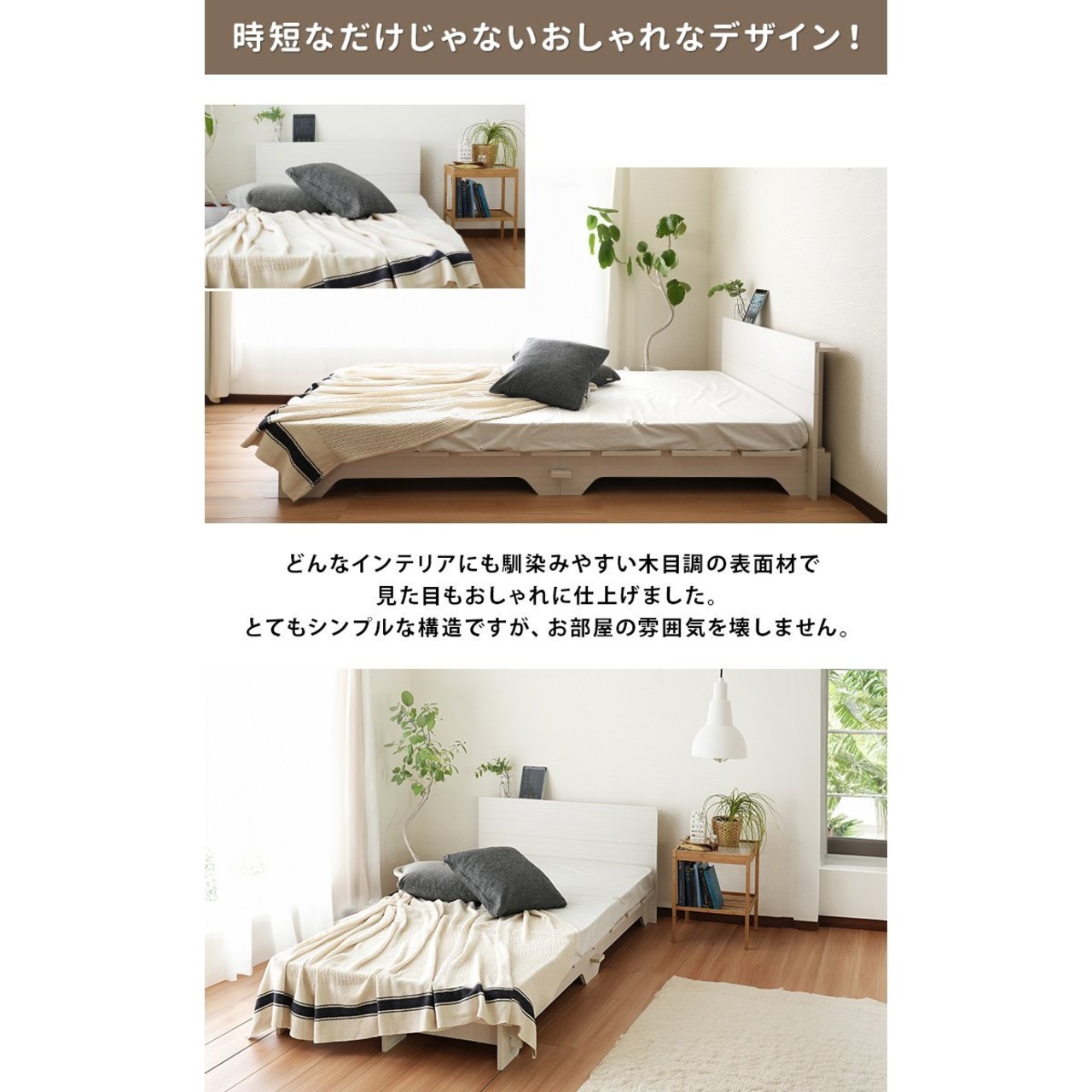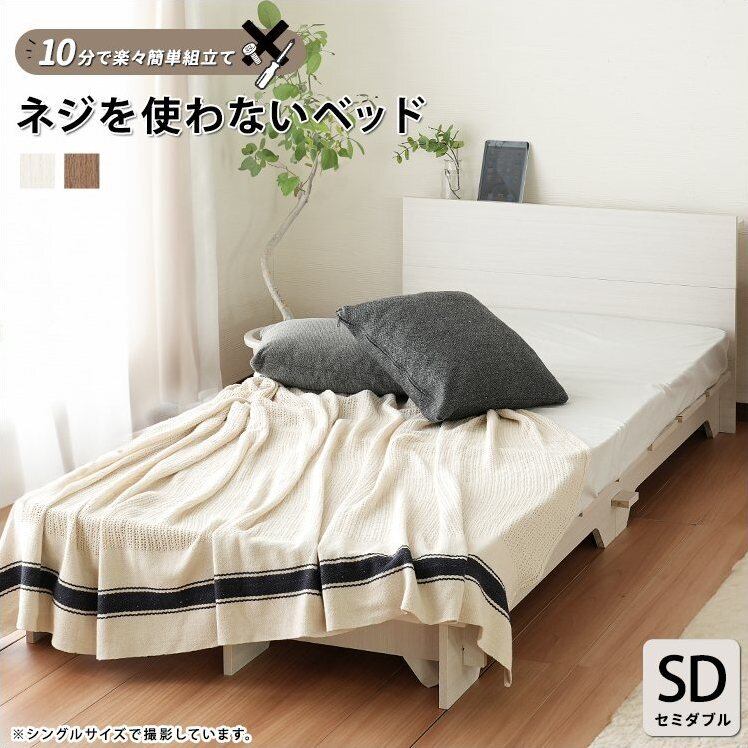 ネジを使わないベッド 楽々簡単組立て セミダブルサイズ フレームのみ jx44704 工具不要 すのこ仕様 シンプル構造 木目調 ベージュ アイボリー