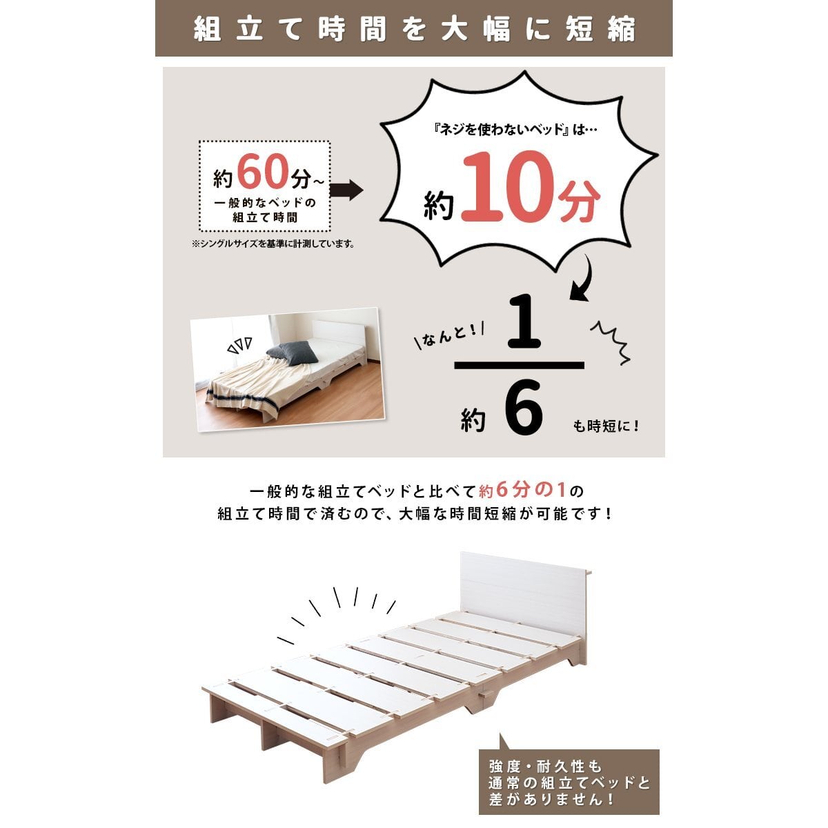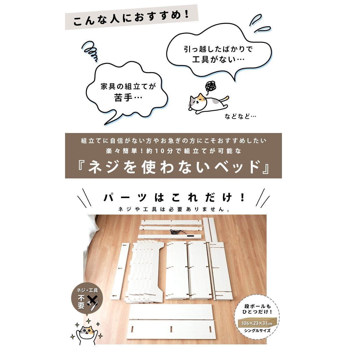 家具の組立てが苦手な方や、引越したばかりで工具が無い方におすすめな【ネジを使わないベッド】は、誰でも簡単に約10分程度で組立て頂けます。