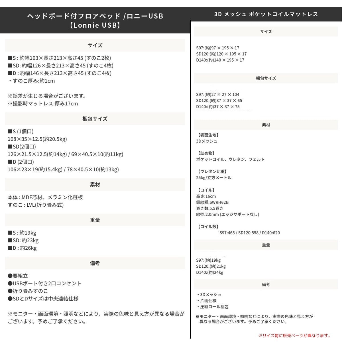 S : 幅97×長さ195×厚み17cm