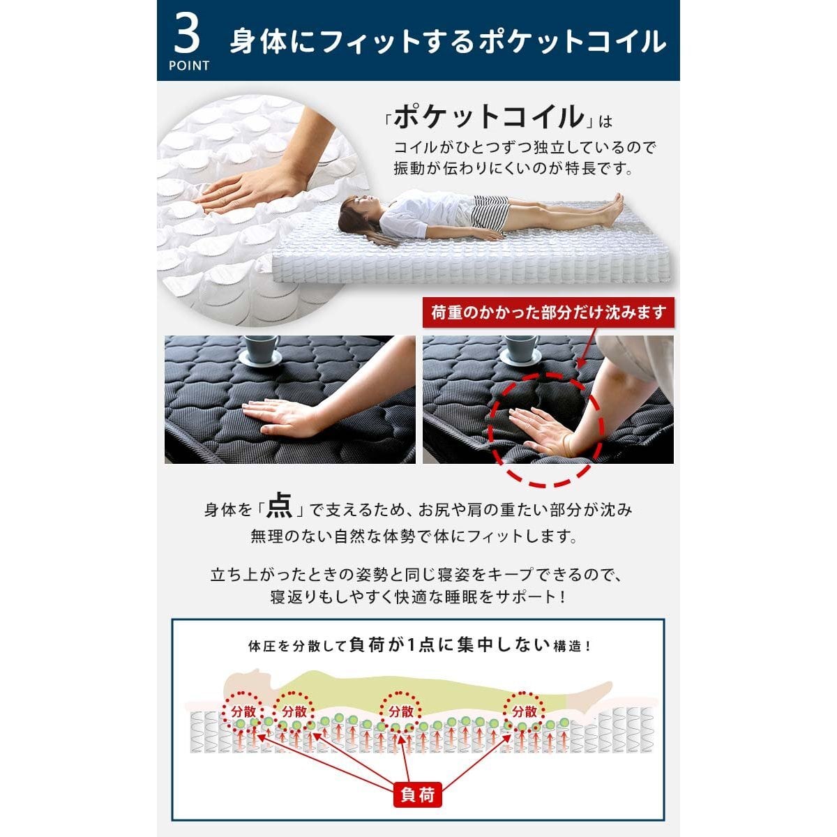 厚さ10cmのポケットコイルが、しっかりと身体を支えてくれるから、翌朝の目覚めが変わります。