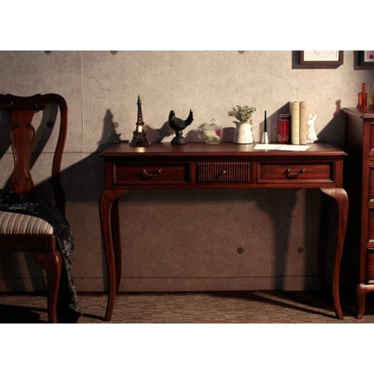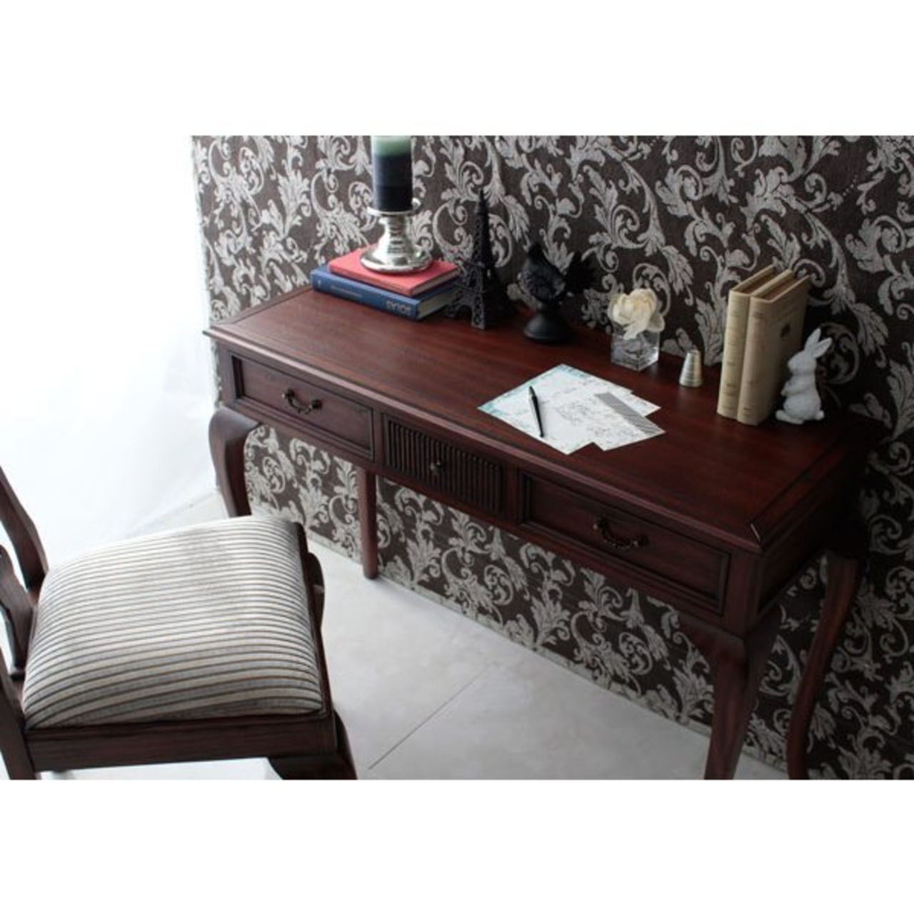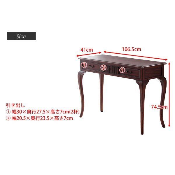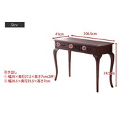 ちょっとした書き物机として、またディスプレイ用のテーブルとしても重宝するテーブル。スリムな天板が上品です。引き出し(大)2杯、(小)1杯付きで、細々した小物の整理にも便利です。前面のデザインや取手にもさりげないこだわり。エレガントなネコ脚使いなど、上品にまとめたデザインがおしゃれです。