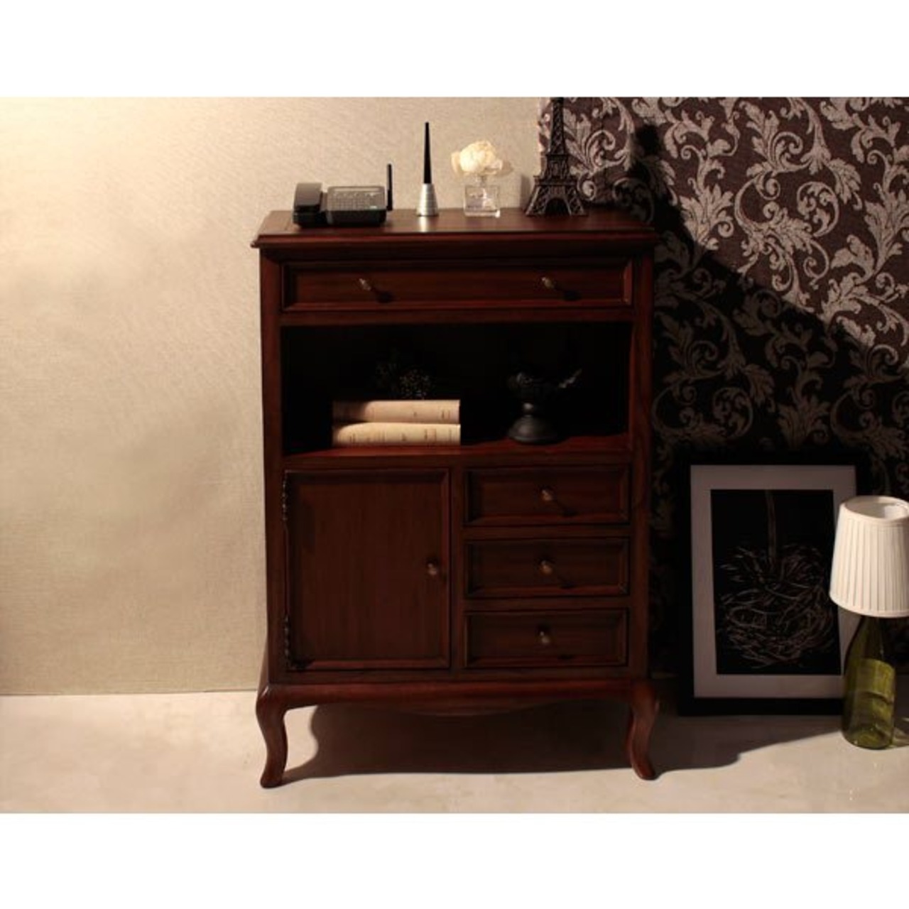 天然木の渋い色調と、アンティーク風の取手、ネコ脚が印象的なファックス台。大小の引き出しが計4杯と、扉付き棚、オープン棚がついて、収納力たっぷり。クラシック調のお部屋はもちろん、どんなタイプのお部屋にも馴染みやすいシンプルでトラディショナルなデザインが魅力です。