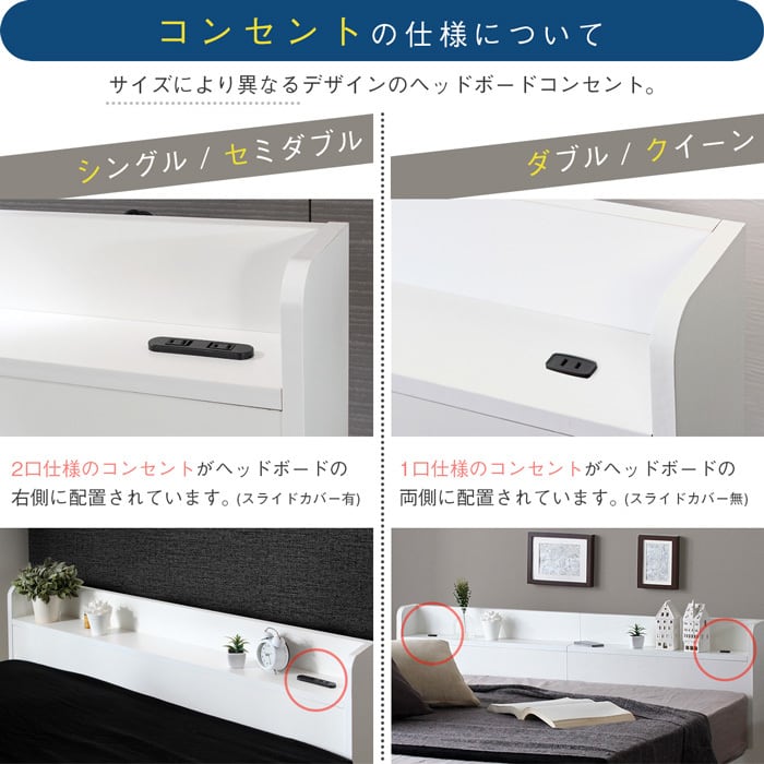 棚部分にはコンセントが付いており、枕元でのスマホやタブレットの充電に便利です。