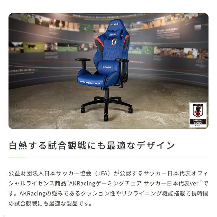 公益財団法人日本サッカー協会(JFA)が公認するサッカー日本代表オフィシャルライセンス商品“AKRacingゲーミングチェア サッカー日本代表ver.”です。