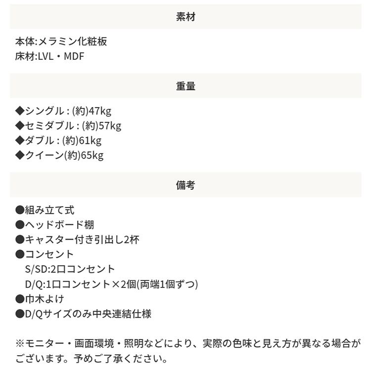 シンプルなデザインでも実用的な多機能をしっかり備えたベッドフレームです。