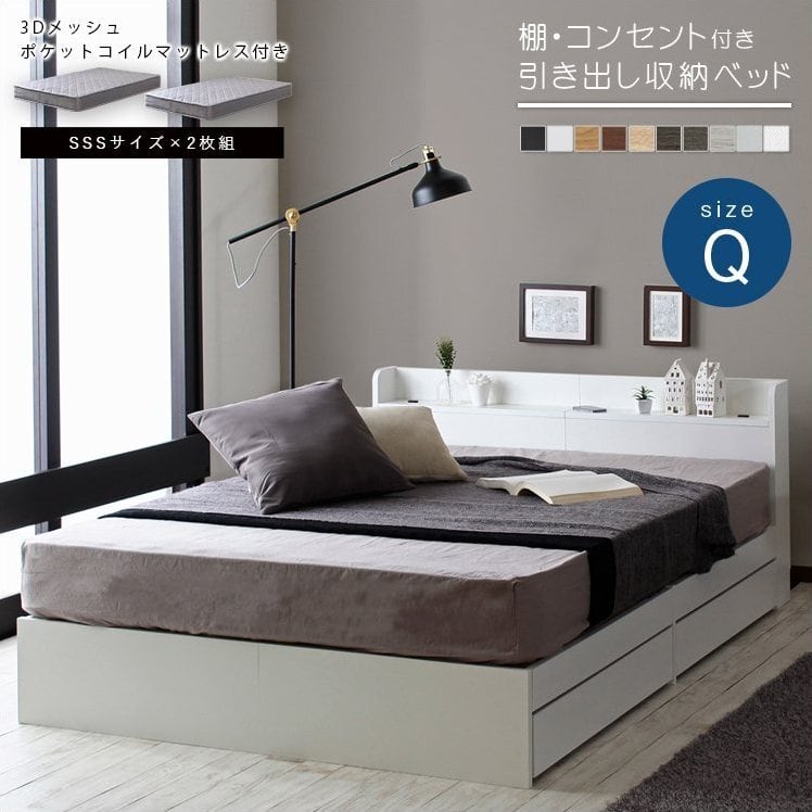 棚・コンセント付き収納ベッド RUES ルース クイーンサイズ グレーポケットコイルマットレスセット acy44116-ri14016gy 引き出し コンセント付き 実用的 多機能 ヘッドボード 高強度 3Dメッシュ生地 通気性