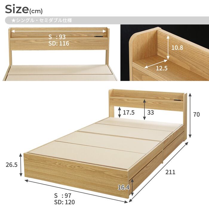 シンプルなデザインでも実用的な多機能をしっかり備えたベッドフレームです。
