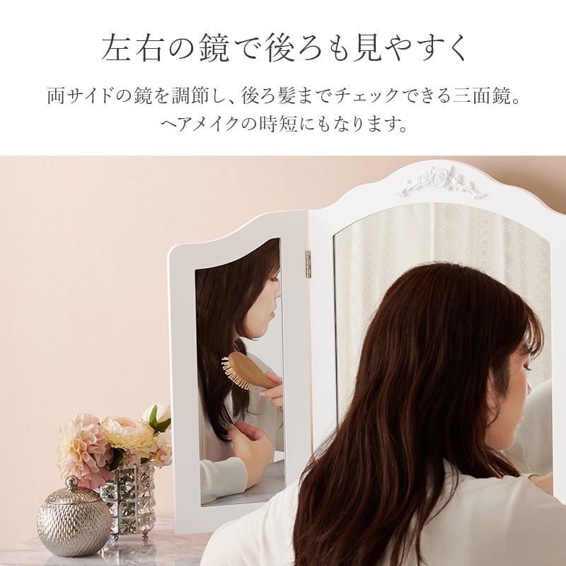 自宅のテーブルに置くだけで、本格的な三面鏡ドレッサーに。メイクやヘアセットに大活躍。