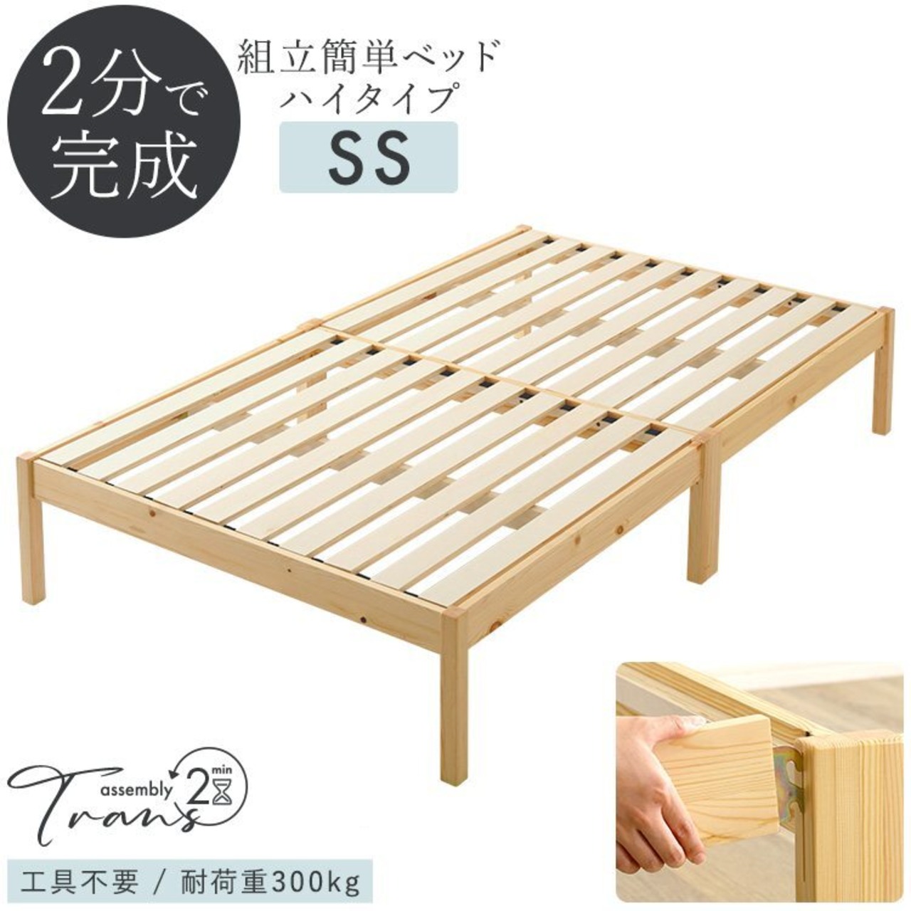 組立簡単ベッド ハイタイプ Trans-トランズ- セミシングルサイズ TRS-H-SS ベッド すのこベッド LVLすのこ 工具不要 2分で完成 簡単組立 通気性 頑丈性 耐荷重300kg 天然木 パイン コンパクト梱包 SS