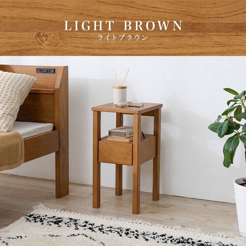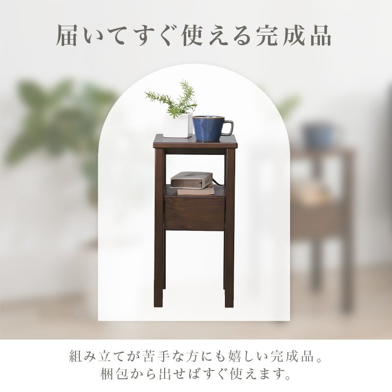 ベッドサイドやソファーサイドに置きやすいコンパクトサイズ。オープン棚と引出し付きで使いやすい。