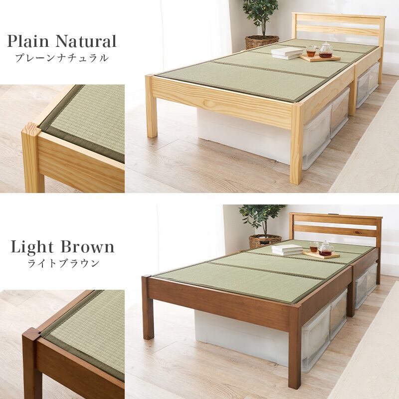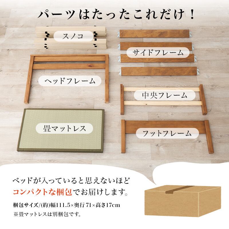 ネジなし、工具不要で簡単組立。爽やかな天然い草を使用した畳マットをすのこベッドに合わせました。スマートフォンなどの充電やライトの取り付けに便利な宮棚とコンセント付き