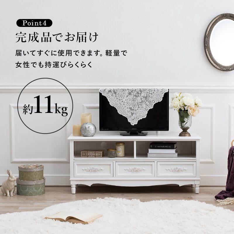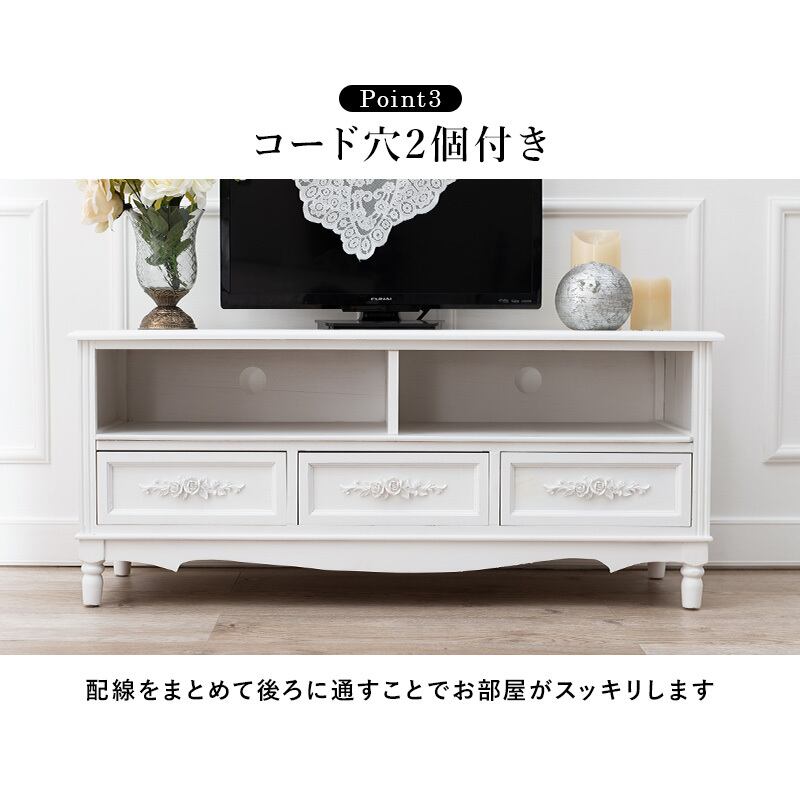 テレビ台 MTV-8193 完成品 テレビボード リビングボード 幅105cm アンティーク調 ホワイト家具 天然木 桐材 オープン収納 引き出し収納 浮き彫り 薔薇 バラ 取っ手 42インチ