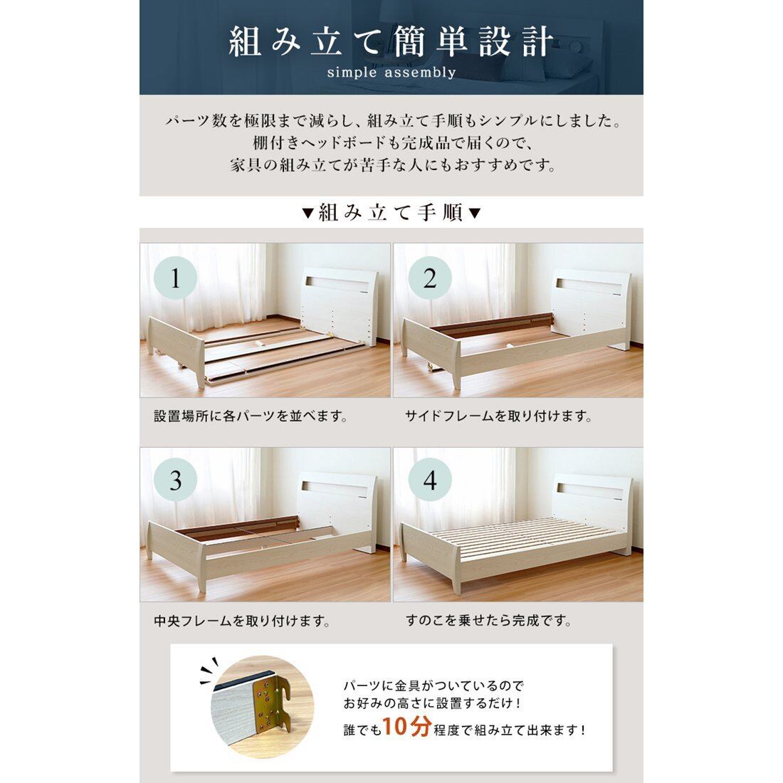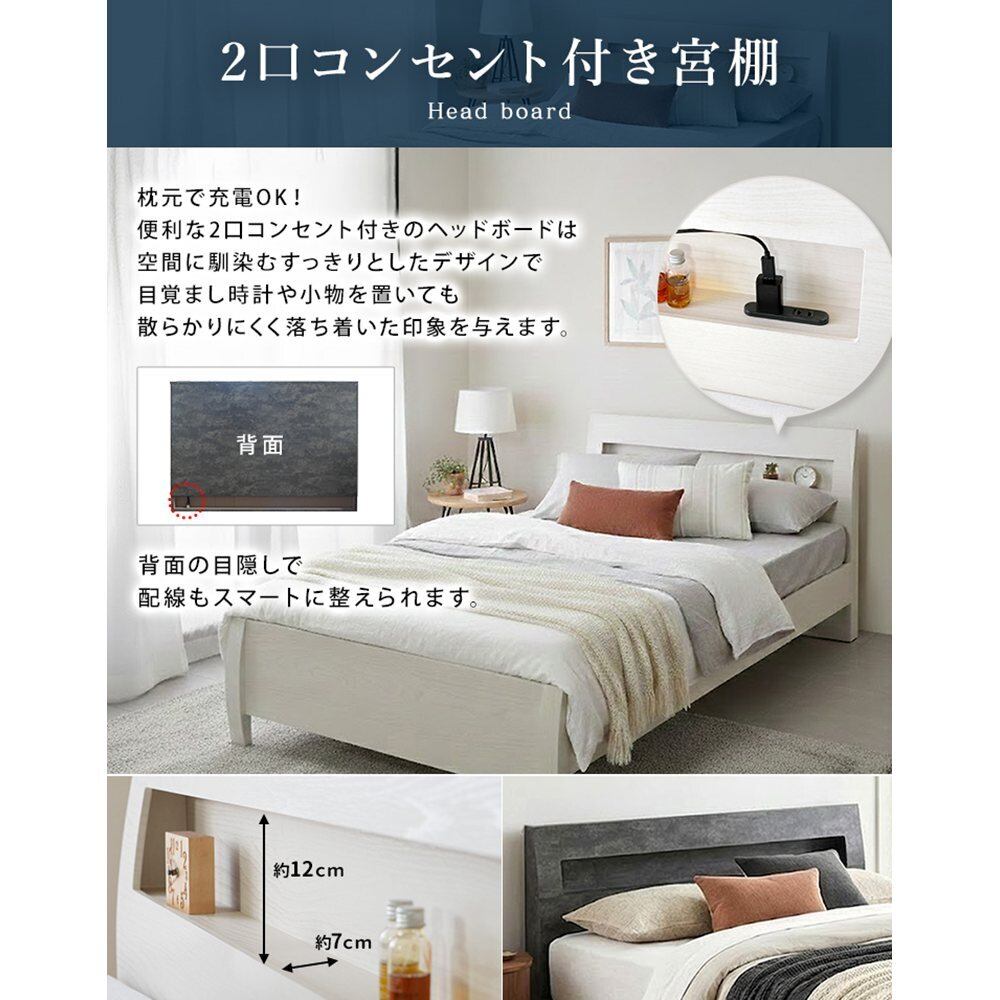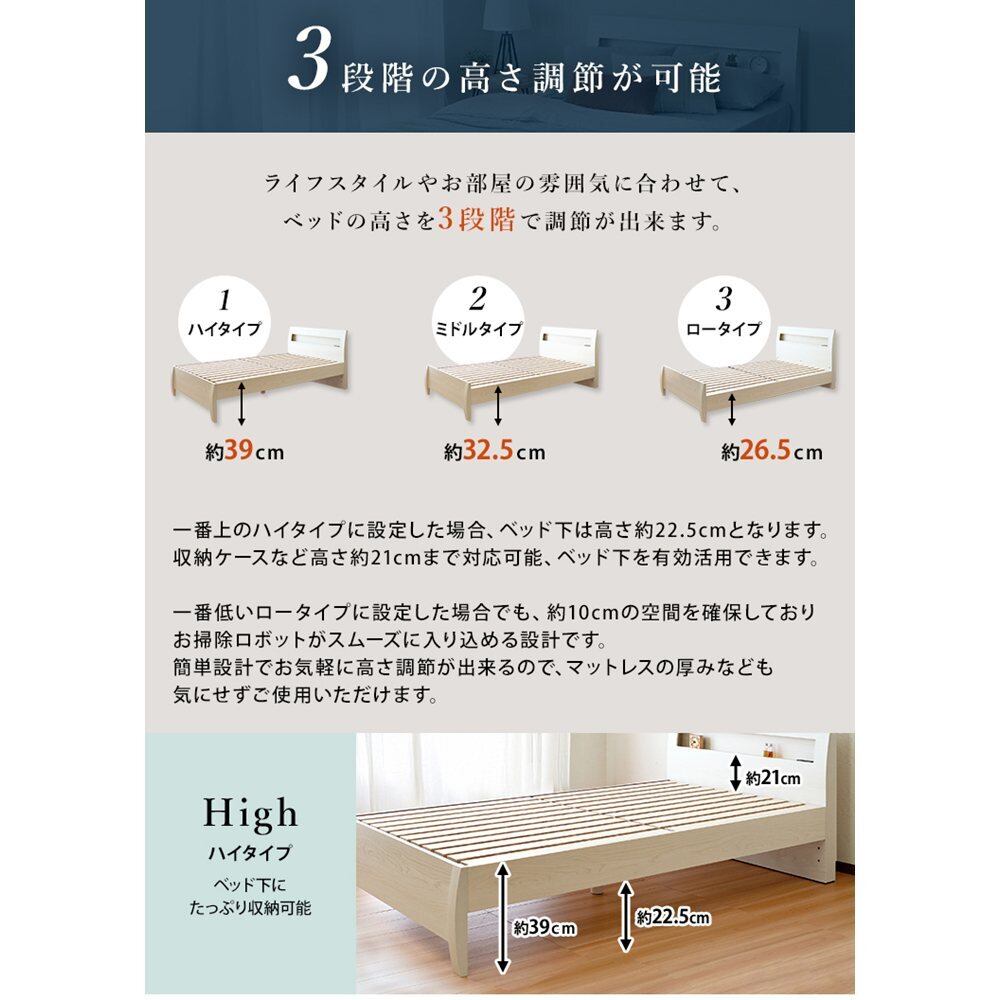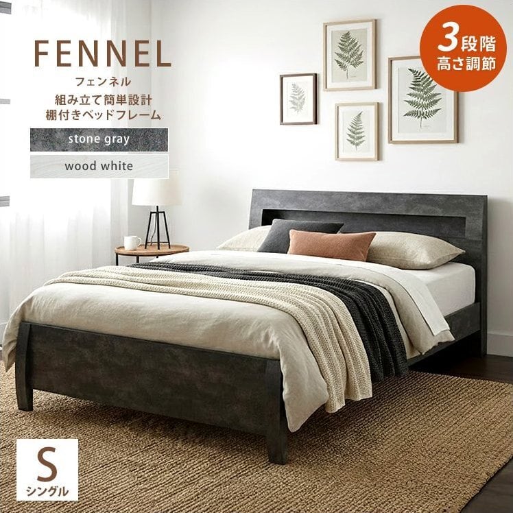 FENNEL【フェンネル】ベッドフレーム シングルサイズ jx44733 ベッド 棚付きベッド 組立簡単 3段階高さ調節 宮棚 2口コンセント付き すのこ