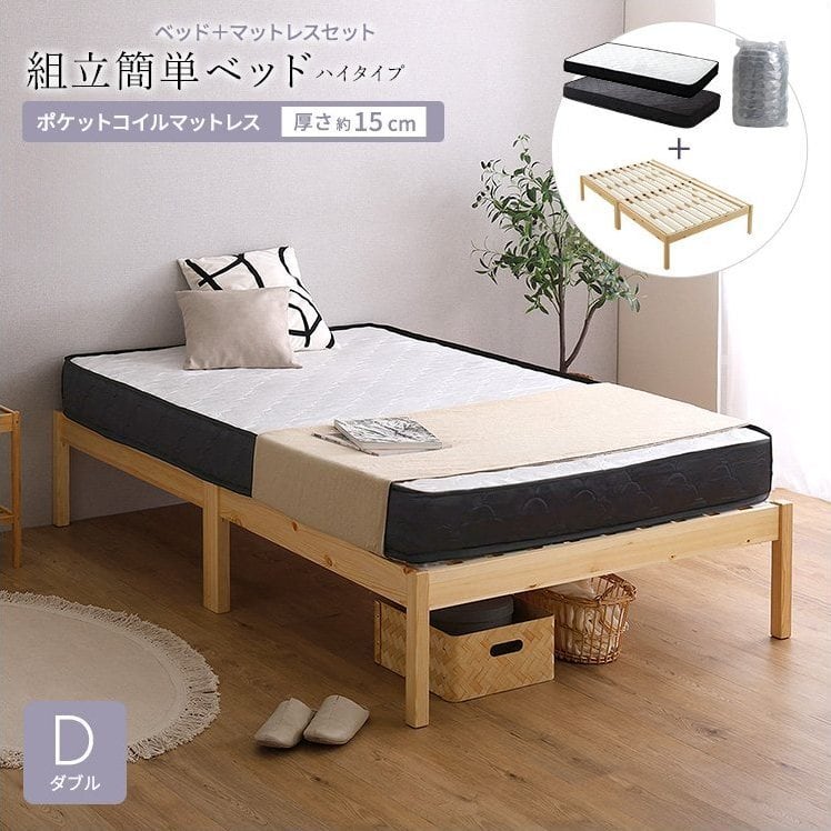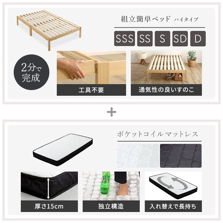 2分で完成!組立簡単ベッド ハイタイプ ポケットコイルマットレスセット!
