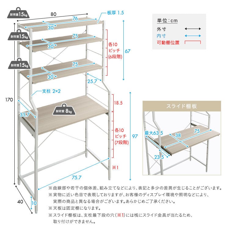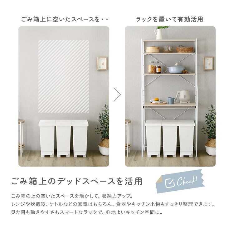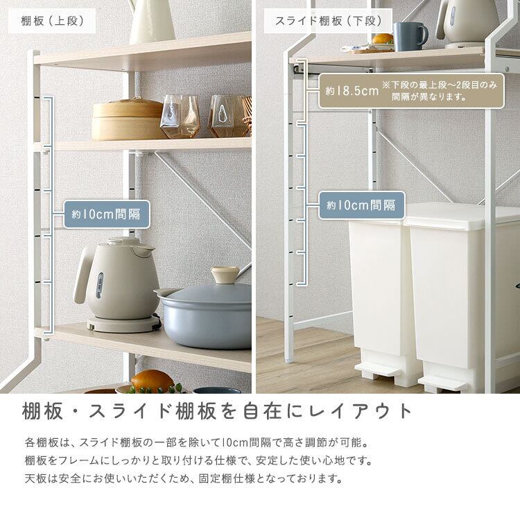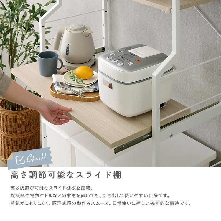 高さ調節可能なスライド棚付きなので、お持ちのキッチン周りの家電やごみ箱のサイズに合わせて使えます!
