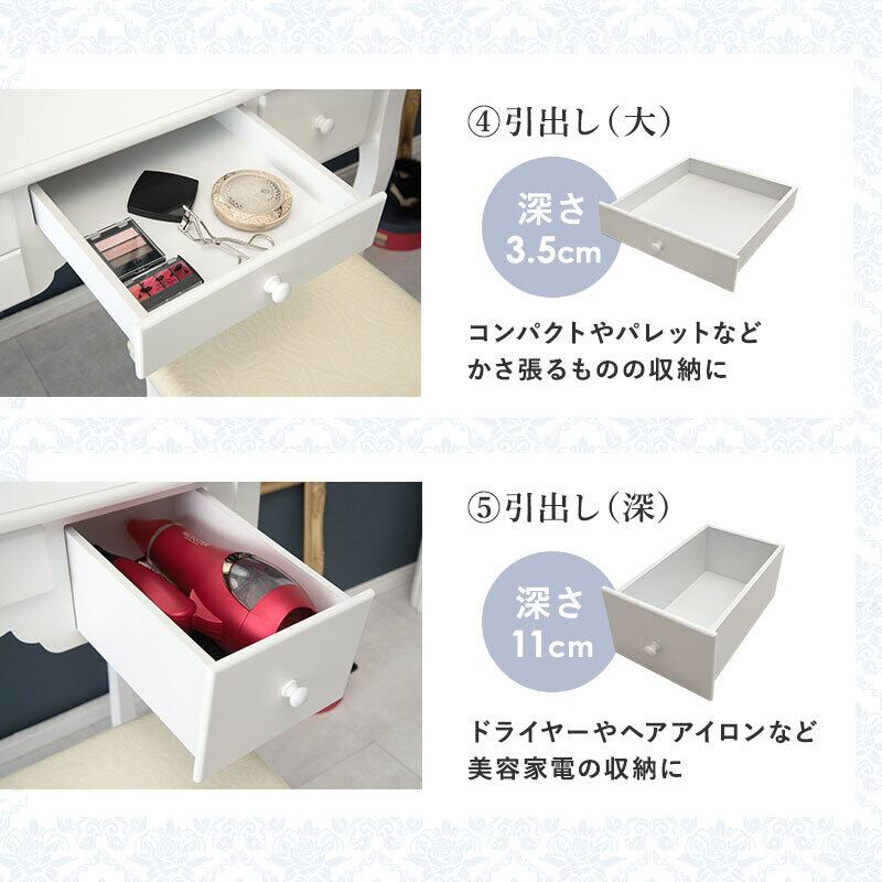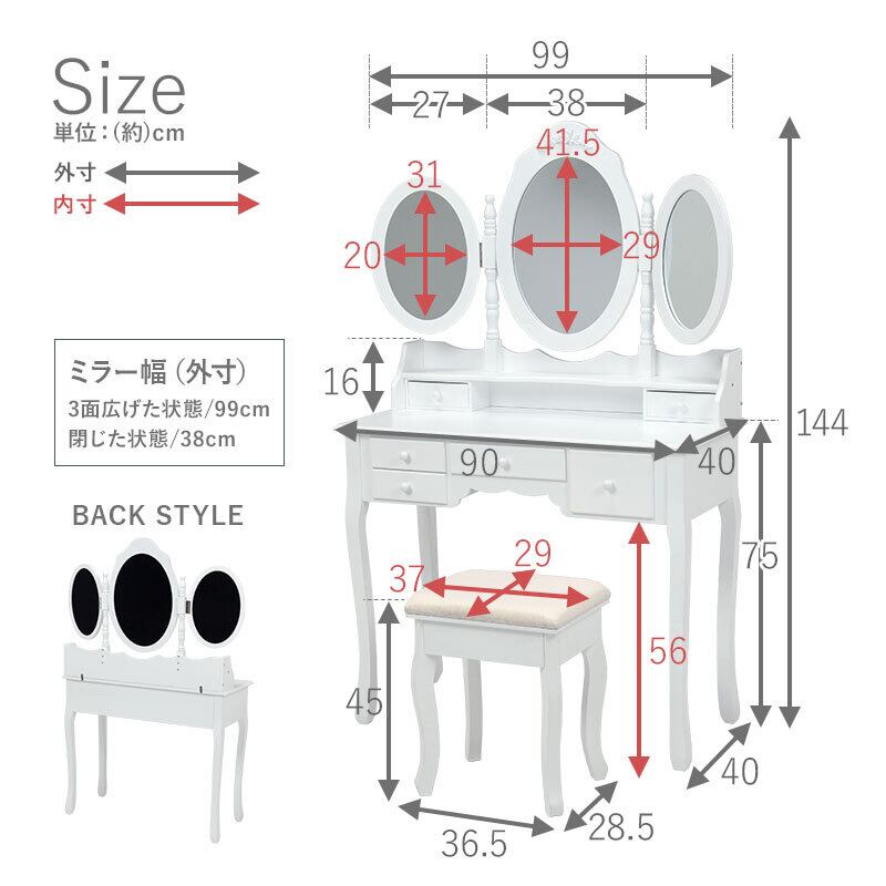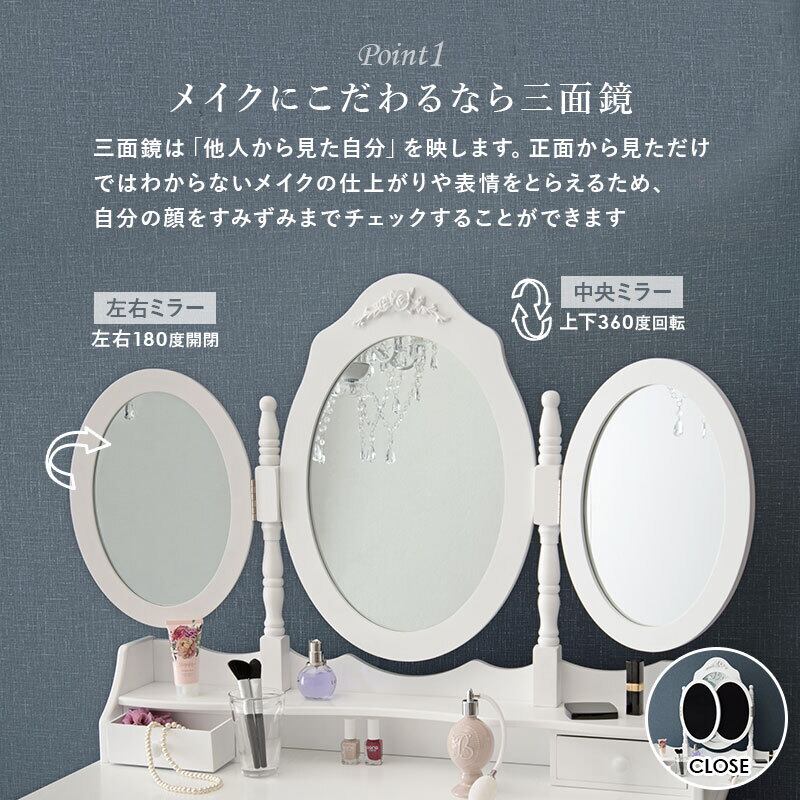 三面鏡ドレッサーセット MD-6563 幅90cm ドレッサー スツール付き 楕円形 清楚 引き出し収納 大容量 ホワイト