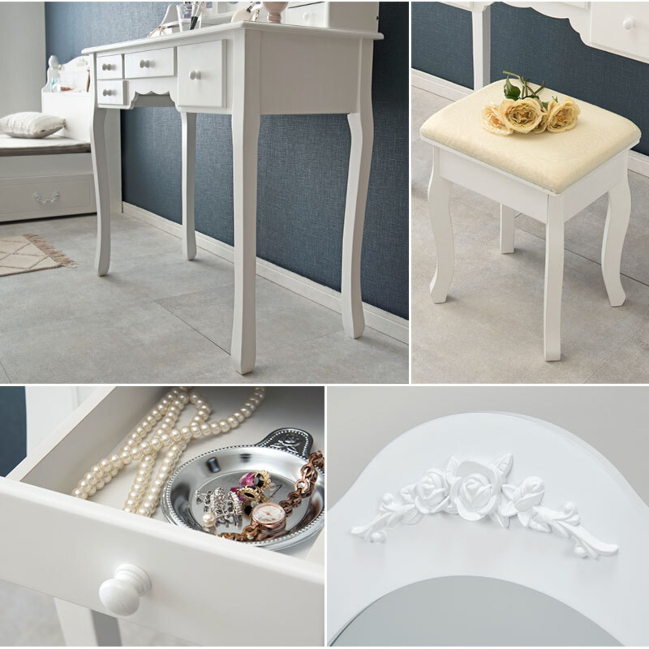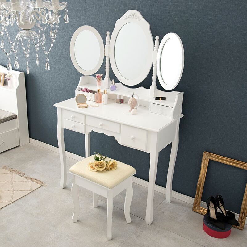 楕円形の三面鏡と脚の曲線が上品なドレッサーセット。スツール付き