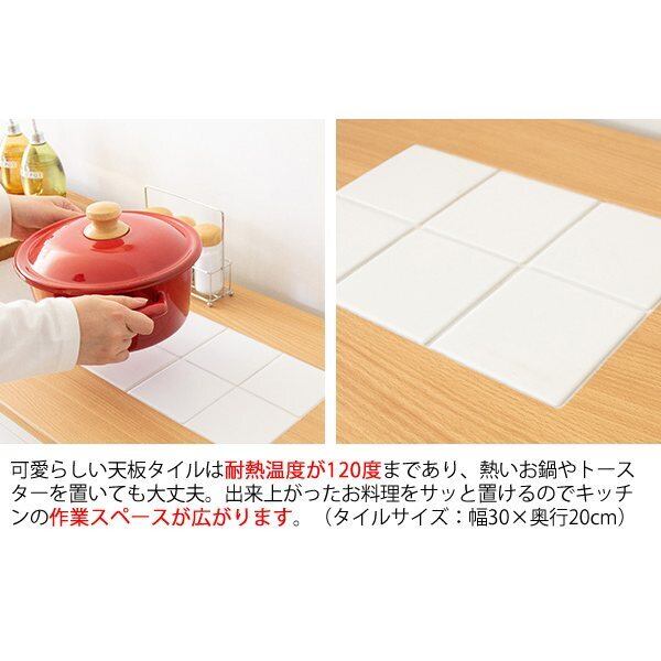 天板上にはタイルが敷かれており、熱いお鍋やトースターを置くことができとても便利。ガラスが美しい開き扉の中には可動棚を設けており、お好みに合わせて自由に収納できます。