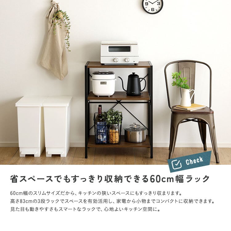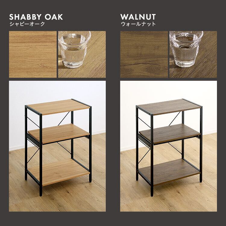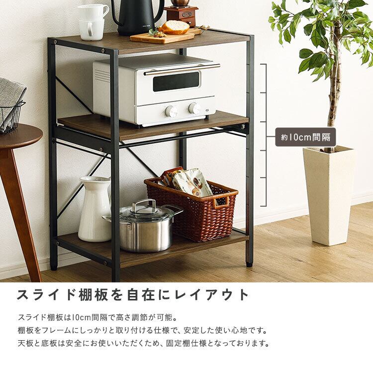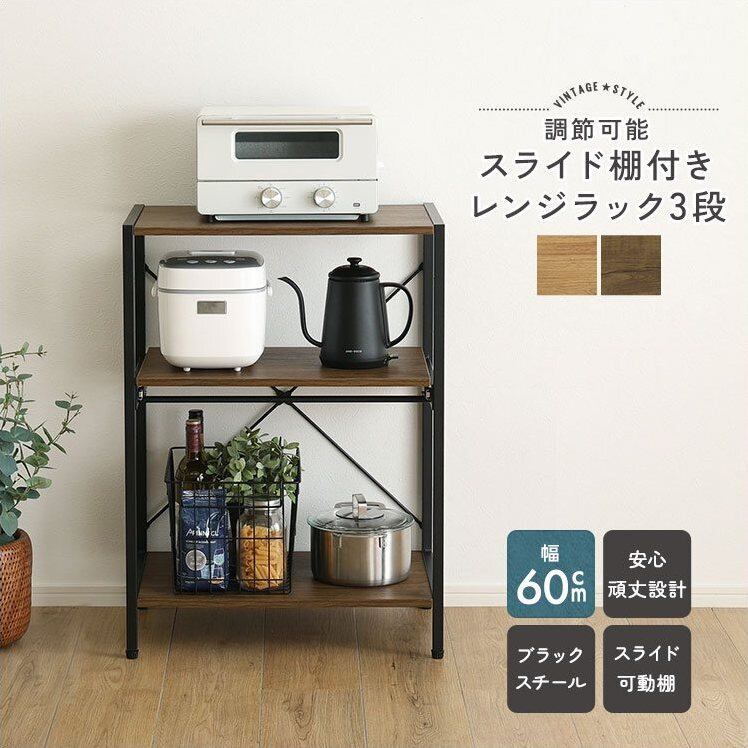 ヴィンテージ調調節可能スライド棚付きレンジラック3段 VRZ-3 幅60cm ロータイプ レンジラック レンジ台 キッチンラック キッチン家電収納 スライド棚 可動棚 アジャスター付き