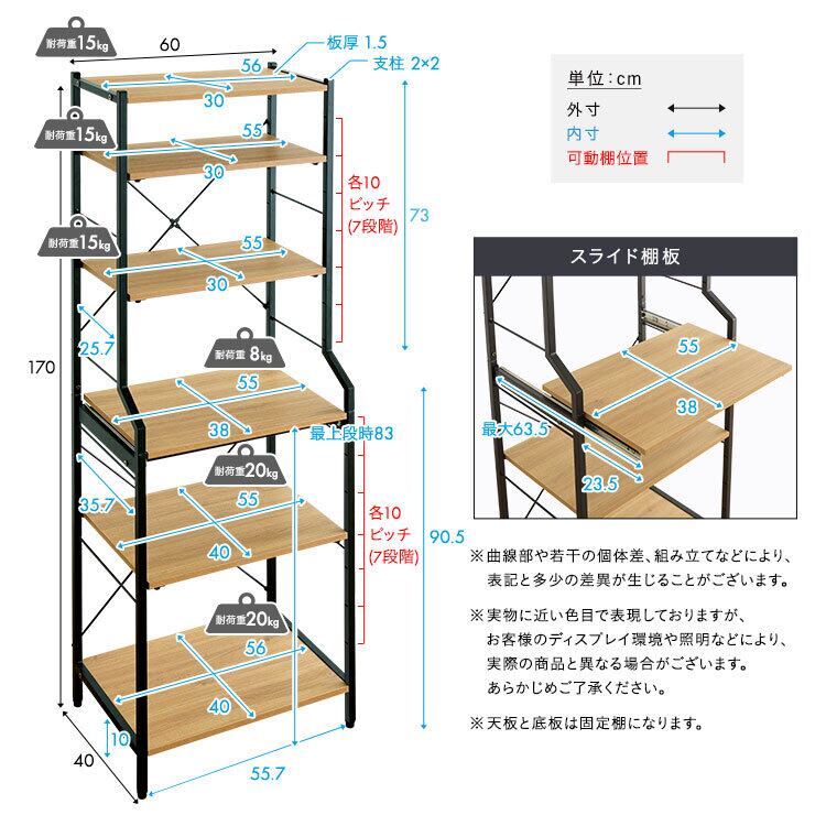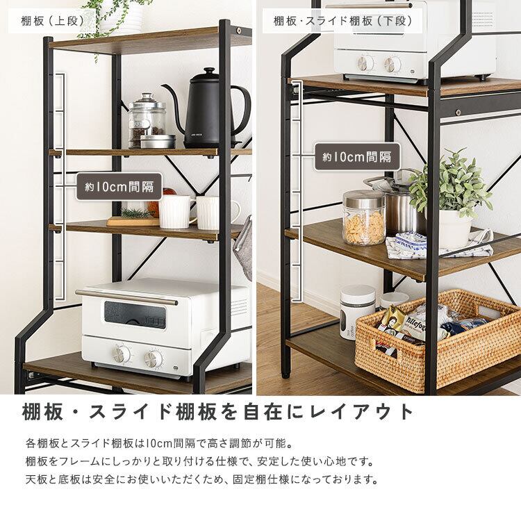 ヴィンテージ調調節可能スライド棚付きレンジラック6段 VRZ-6 幅60cm ハイタイプ レンジラック レンジ台 キッチンラック キッチン家電収納 スライド棚 可動棚 アジャスター付き