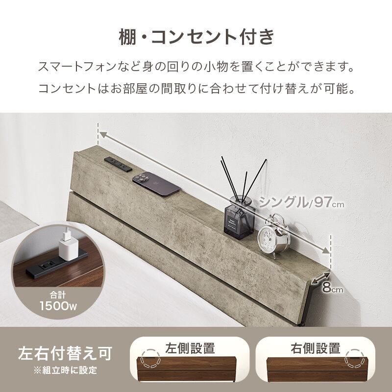 シングルベッド KH-3073S フレームのみ ロータイプ ベッド スチールフレーム 棚付き 2口コンセント付き 耐荷重300㎏ 通気性