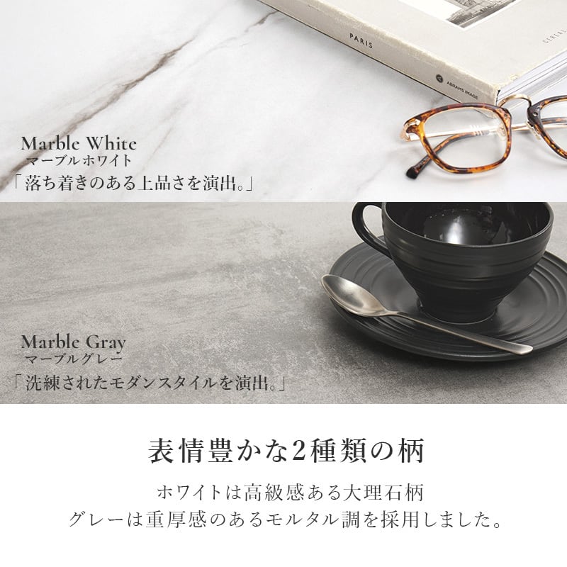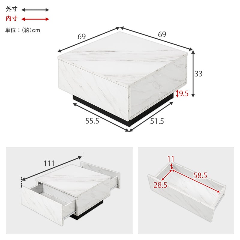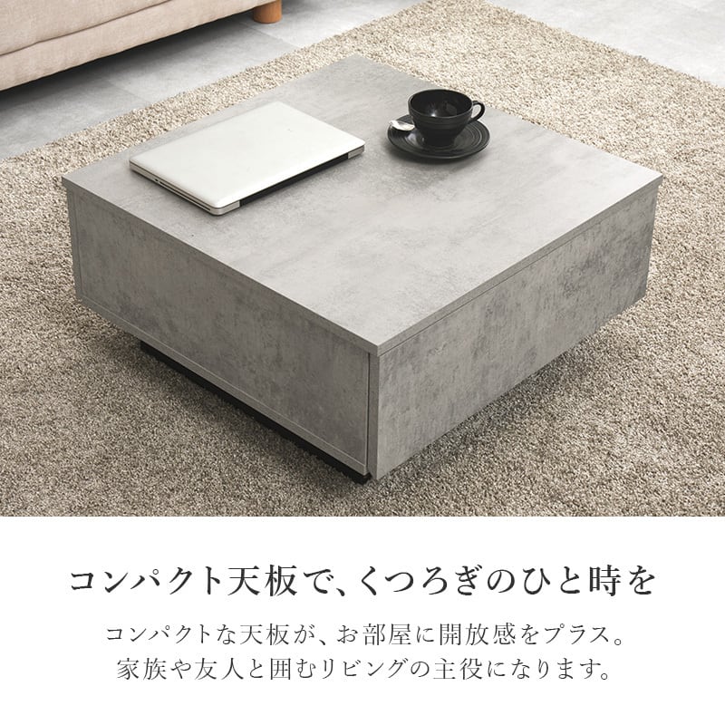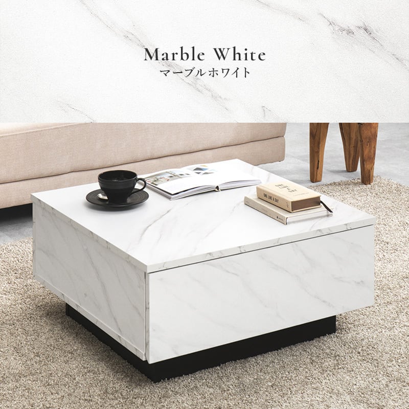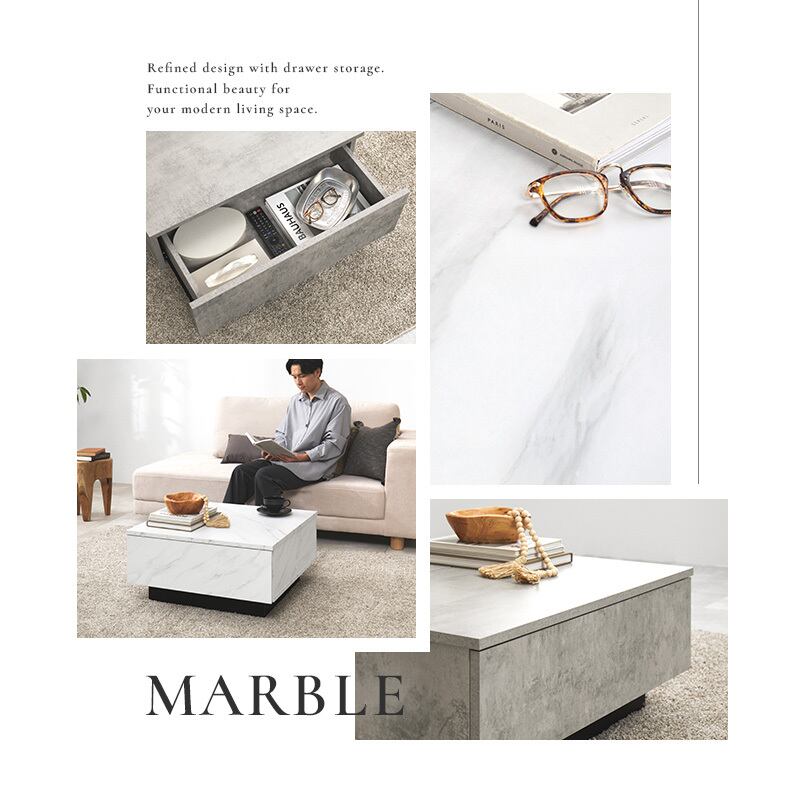 お部屋を広く見せるロータイプの石目調テーブル。大きな引出し2杯付きで生活感が出やすいリビング小物を収納できます。