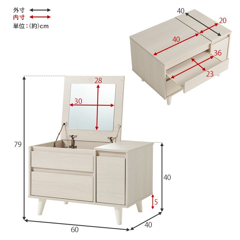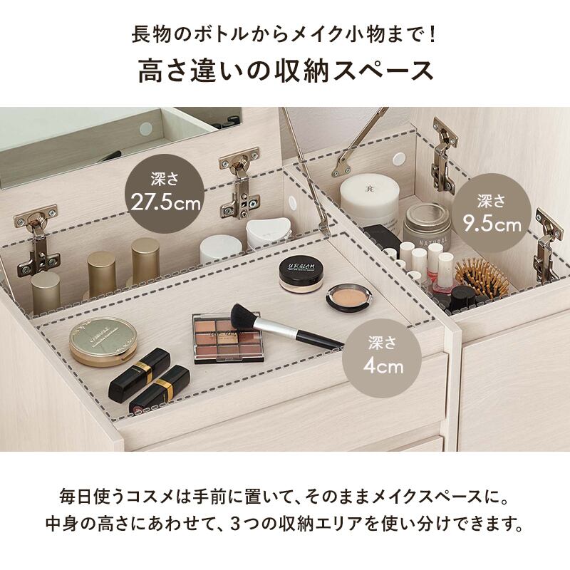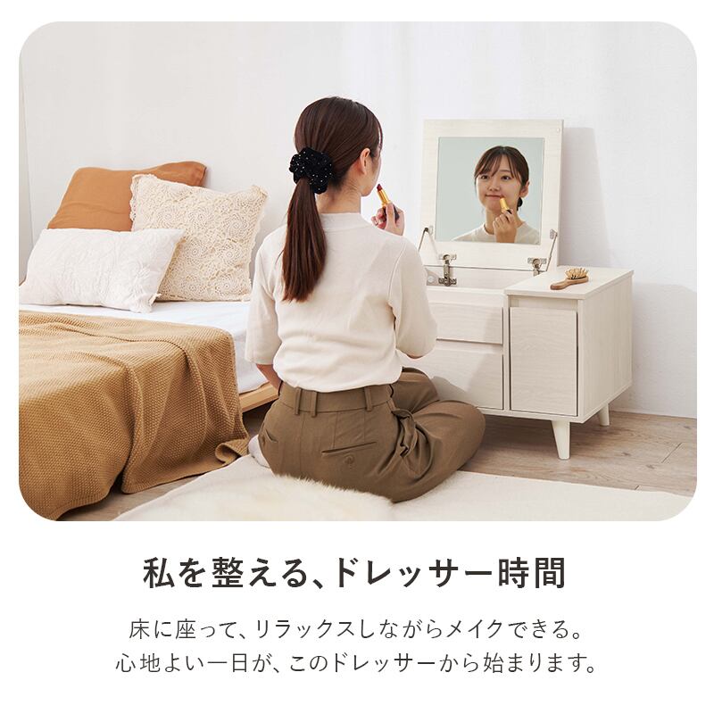 天板を開くとドレッサーとして使えるコスメテーブル。メイクがしやすい大きなミラーや収納がついているのに幅60センチとコンパクトでお部屋に置きやすいサイズです。