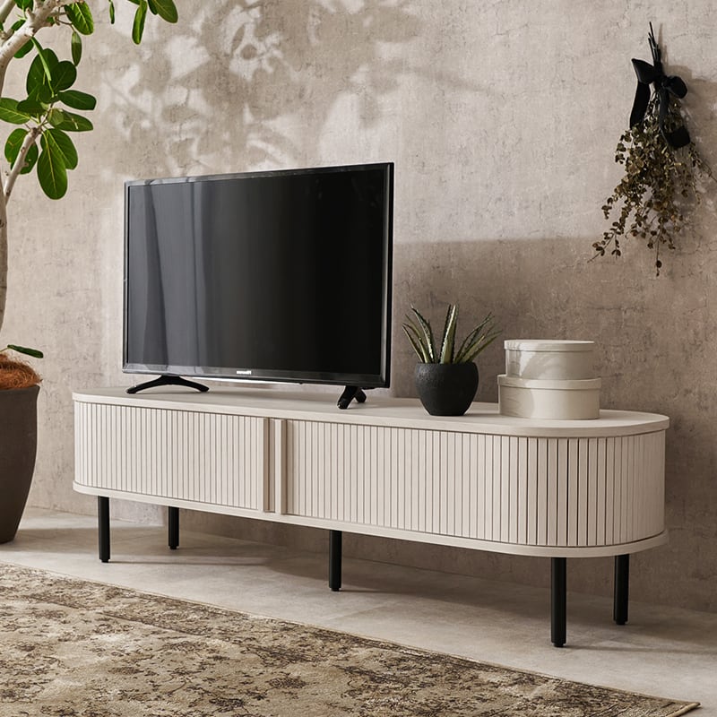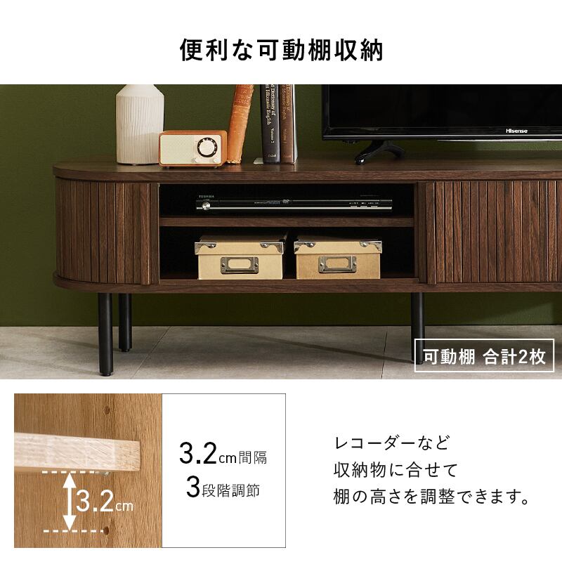 縦のラインとサイドの曲線が美しいタンブール扉のテレビ台。扉の開閉に場所を取らず、すっきりとした脚高デザインもポイントです。ローボードとしても使用可能