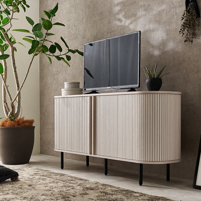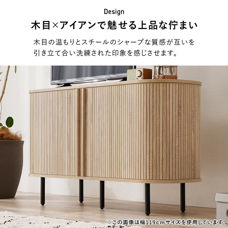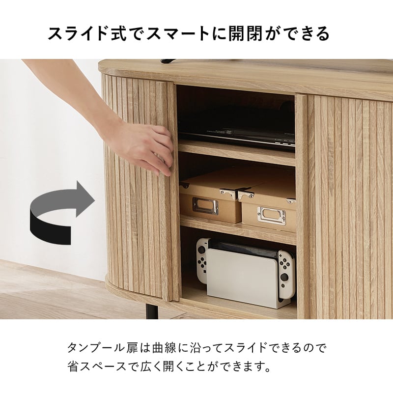 縦のラインとサイドの曲線が美しいタンブール扉のハイタイプテレビ台。扉の開閉に場所を取らず、すっきりとした脚高デザインもポイントです。サイドボード、キャビネット収納としても使用可能