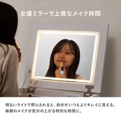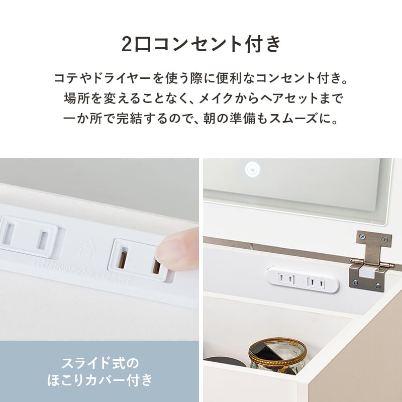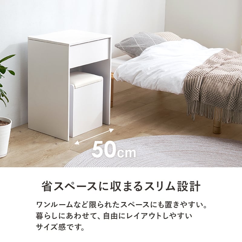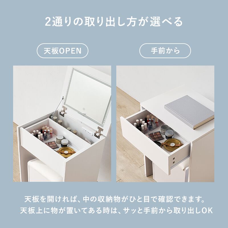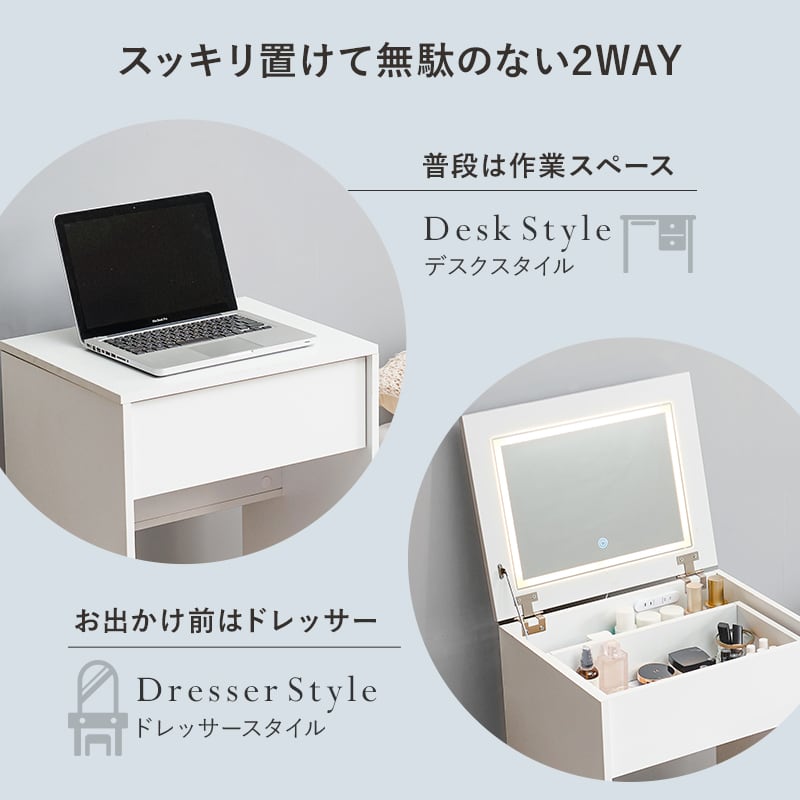 天板を閉じればデスクとして使えるスリムな省スペースタイプの2WAYドレッサーセット。LEDライト付きでメイクがしやすく、ストック品の収納にも使えるスツール付き。