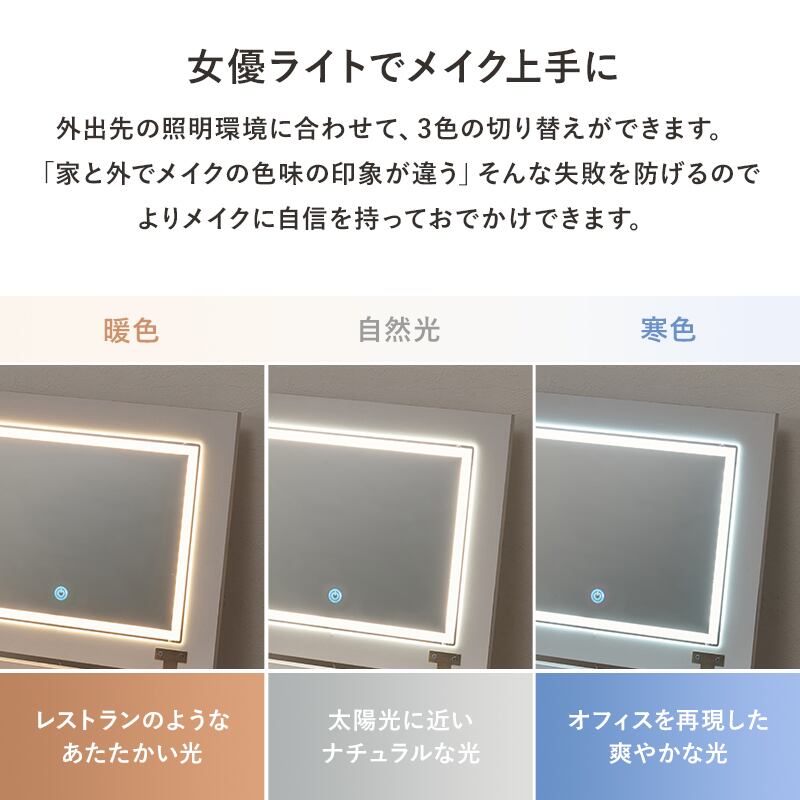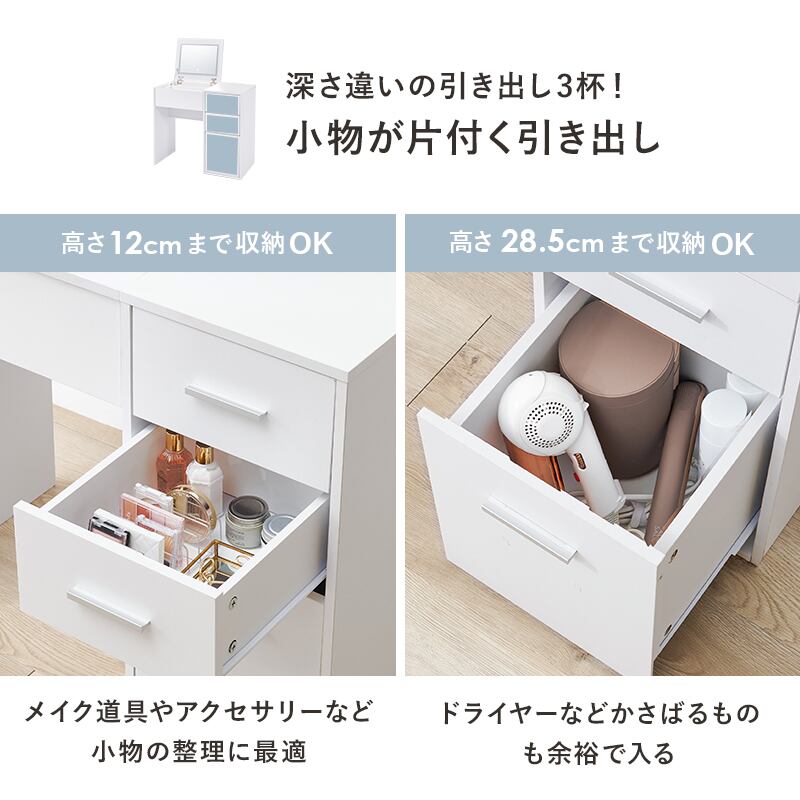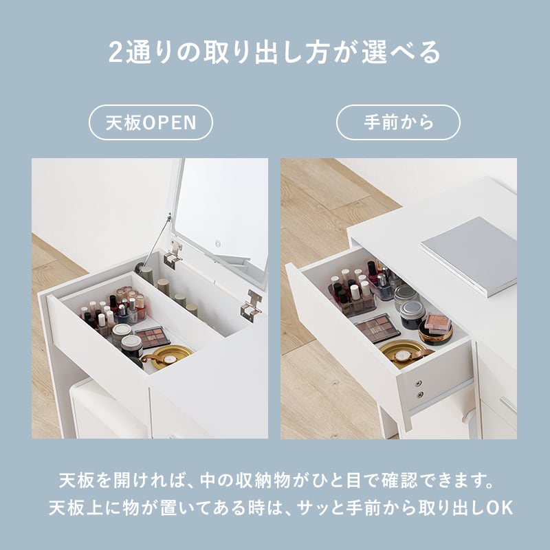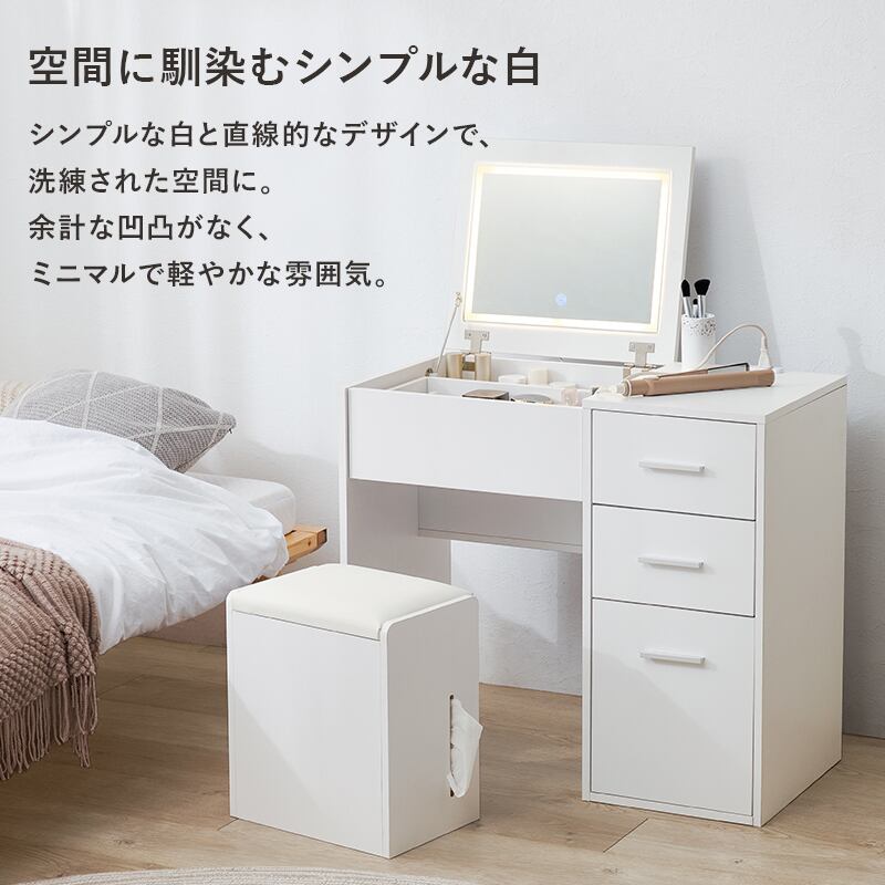 天板を閉じればデスクとして使える2WAYドレッサーセット。LEDライト付きでメイクがしやすく、ストック品の収納にも使えるスツール付き。