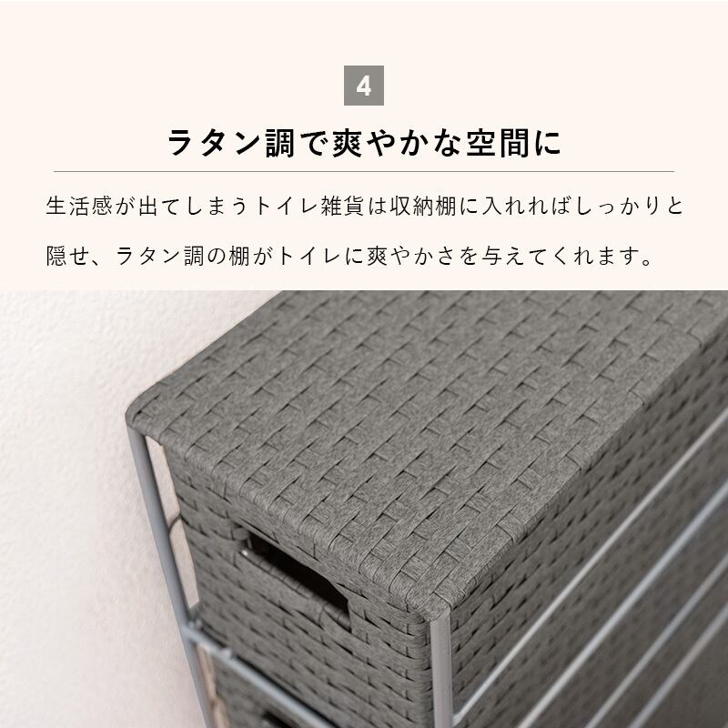 隙間に収まるトイレラック。通気性の良いバスケットの引出しにペーパーロールや小物を収納できます。