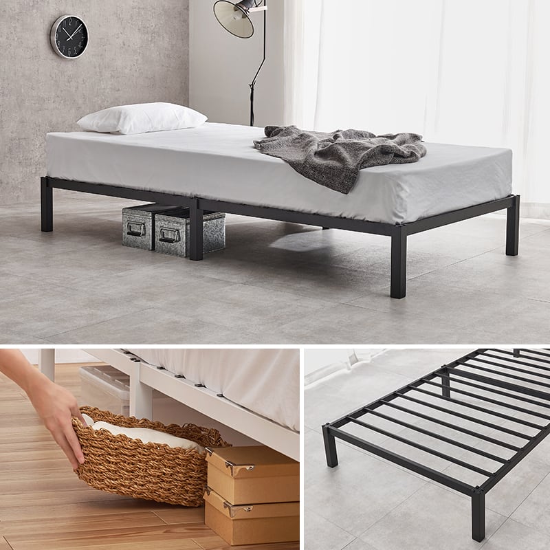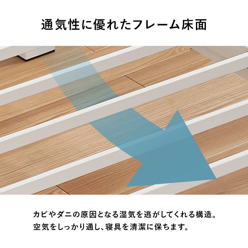 ネジを使わずパーツをはめ込む仕様なのでネジ頭が見えず、すっきりシンプルなデザインのシングルベッド。床面下は衣装ケースなどを入れて収納スペースにもなります。