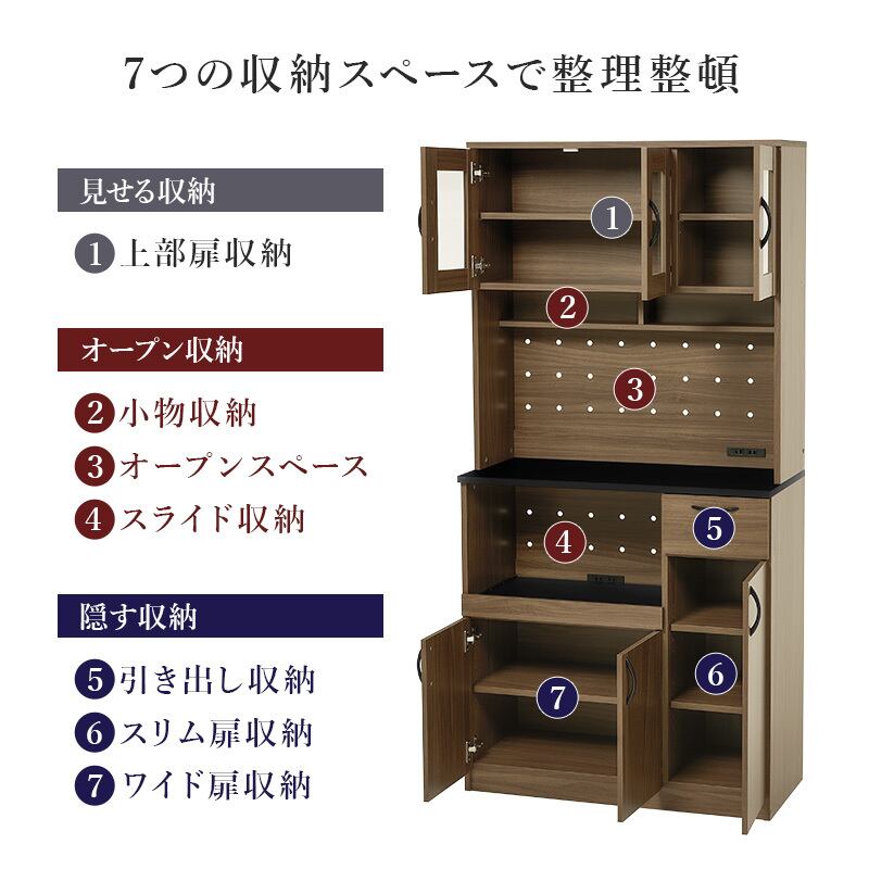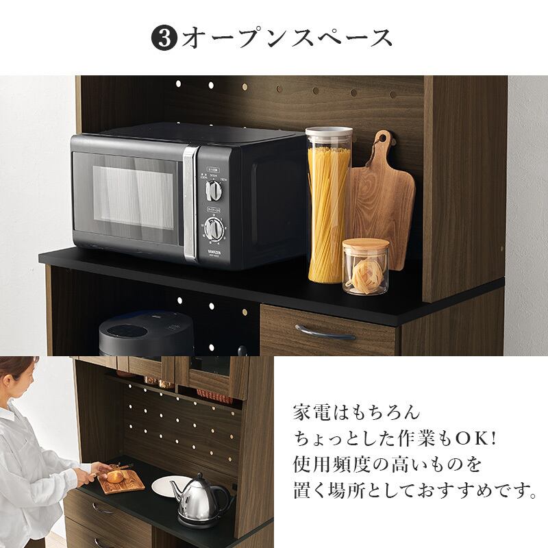 【3月下旬販売開始】キッチン収納 Aタイプ RCC-1421 幅89cm 食器棚 キッチンボード レンジ台 ハイタイプ 家電収納 可動棚 2口コンセント付き 2ヶ所 転倒防止ひも付き